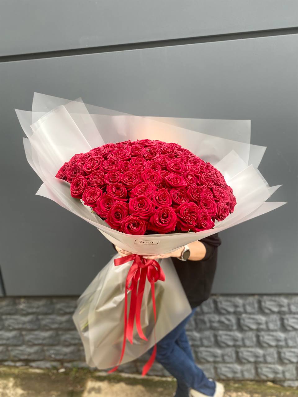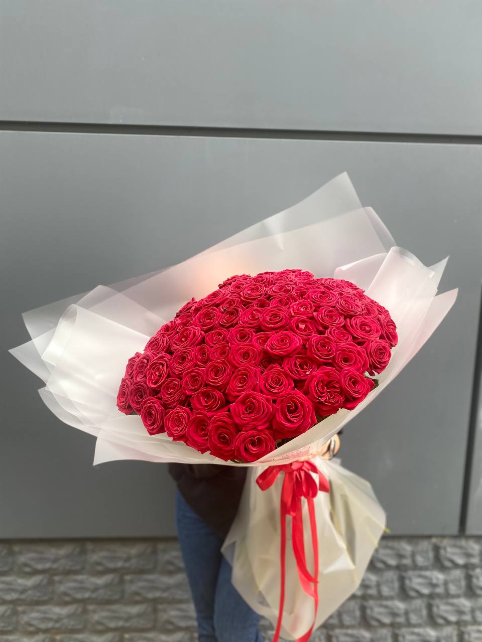 Сто одна голландская роза в букете — это история о масштабе и впечатлении. Объем композиции наполняет комнату и мгновенно притягивает внимание своим присутствием.