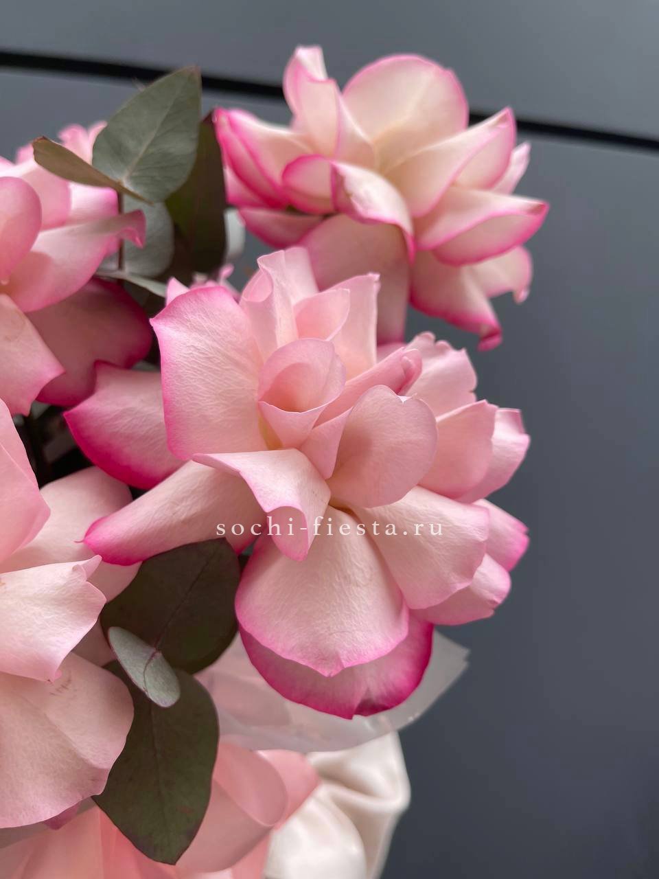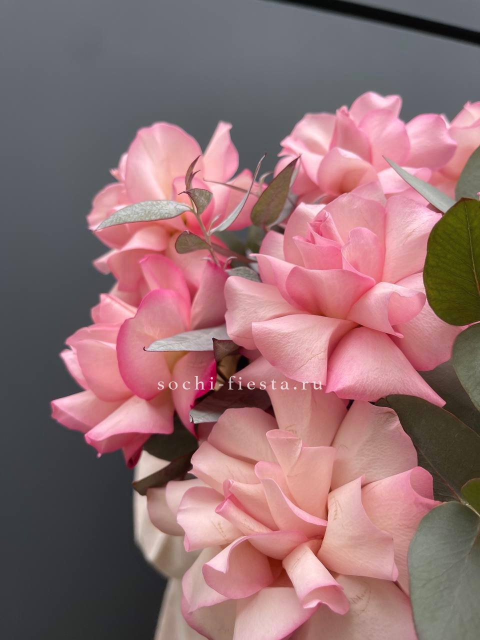 нежный бокс из французских роз сорта Венди, цилиндр D13, эвкалипт, лента, упаковка.