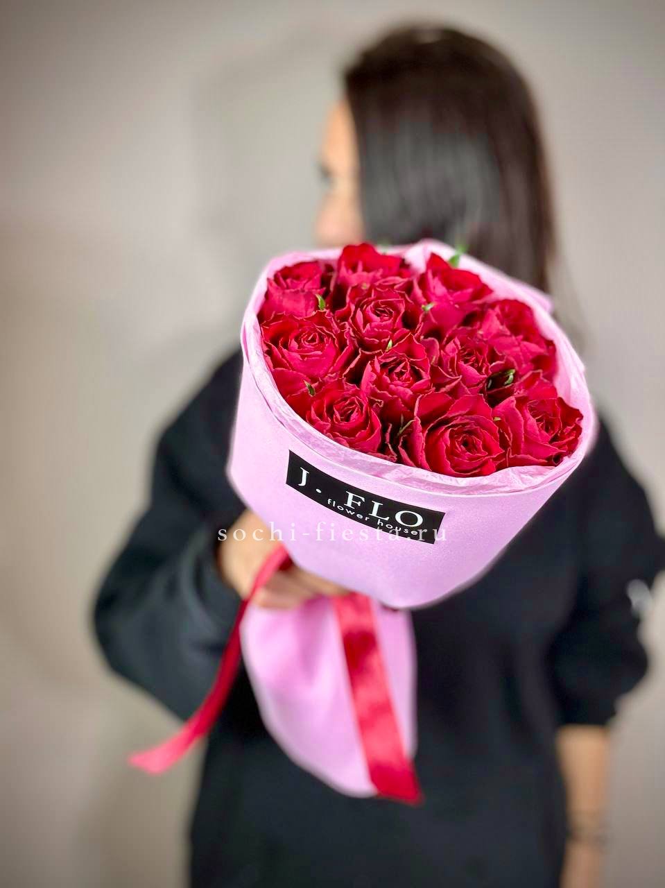 Одиннадцать бутонов кенийской розы собраны в лаконичный букет с комбинированной упаковкой. Красный цвет звучит ярко и уверенно.