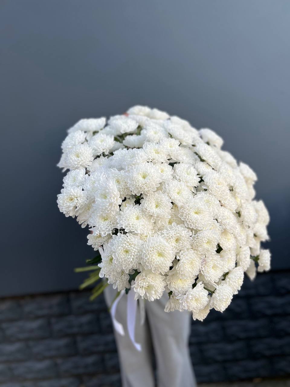 Белоснежные шапки кустовой хризантемы собраны в пышный монобукет, который наполняет пространство свежестью и создает праздничное настроение на любом событии.