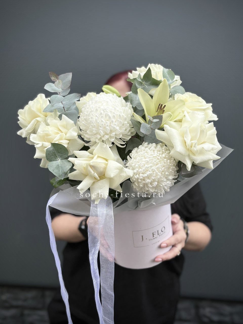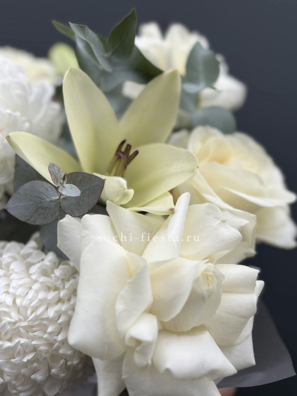 Погрузитесь в облако нежности и аромата! Этот восхитительный букет объединяет пышные шапки хризантем, изысканные бутоны лилий и свежий эвкалипт. Сочетание текстур и деликатных оттенков белого создает ощущение легкости и свежести. Это идеальный подарок для выражения самых светлых и теплых чувств, который растопит любое сердце и наполнит дом чудесным запахом.