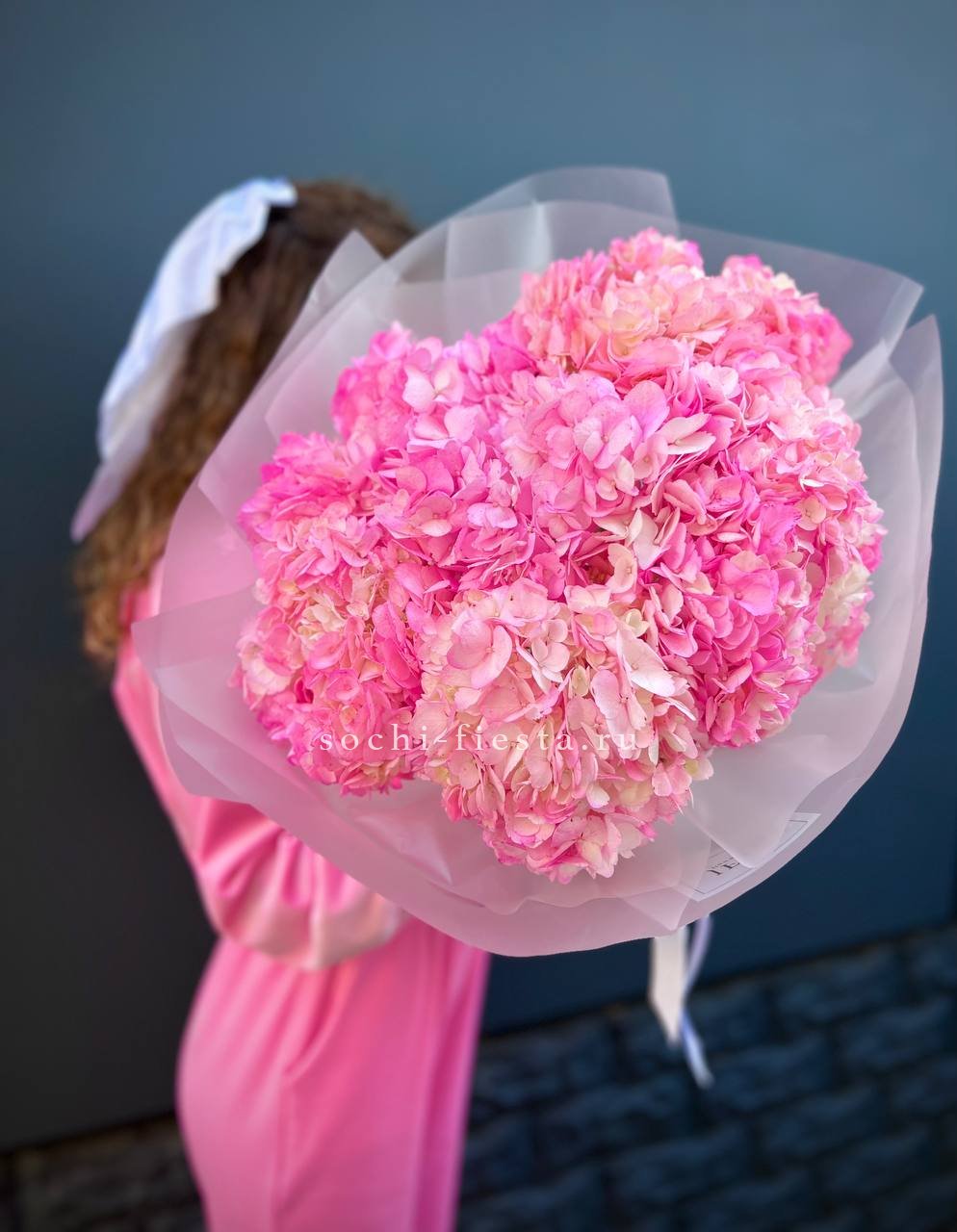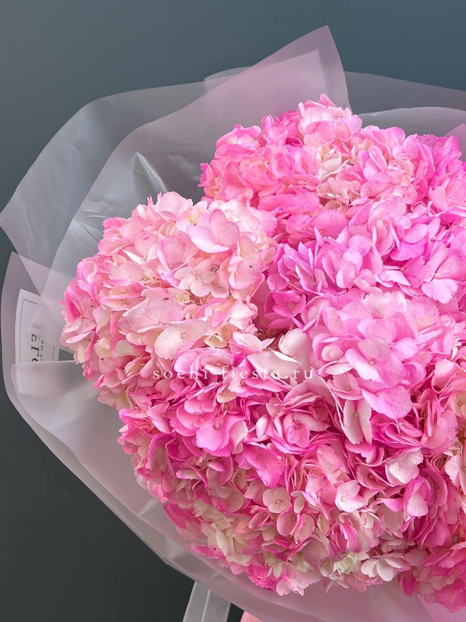 гортензия, хризантема, белая роза, гербера, статица, хлопок, упаковка.