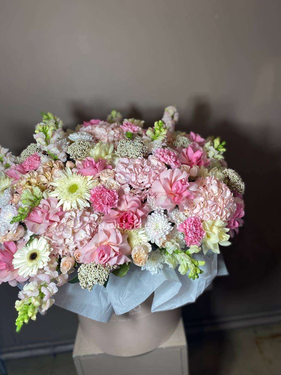 Пышная гортензия обволакивает кустовые розы Мисти Баблс, создавая плотную текстуру с переходами от ягодного к лавандовому. Каждый бутон раскрыт по-своему, образуя живую композицию с глубиной и объёмом.