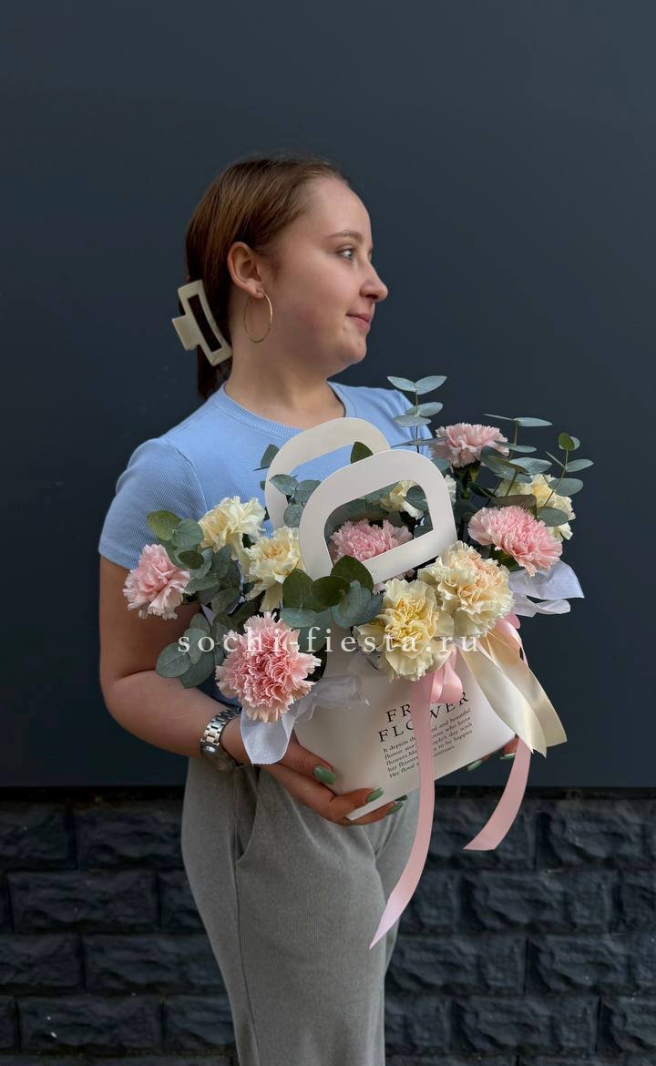Букет из пятнадцати белых диантусов вписывается в любое пространство благодаря компактной форме. Цветы долго сохраняют свежесть и не требуют сложного ухода.