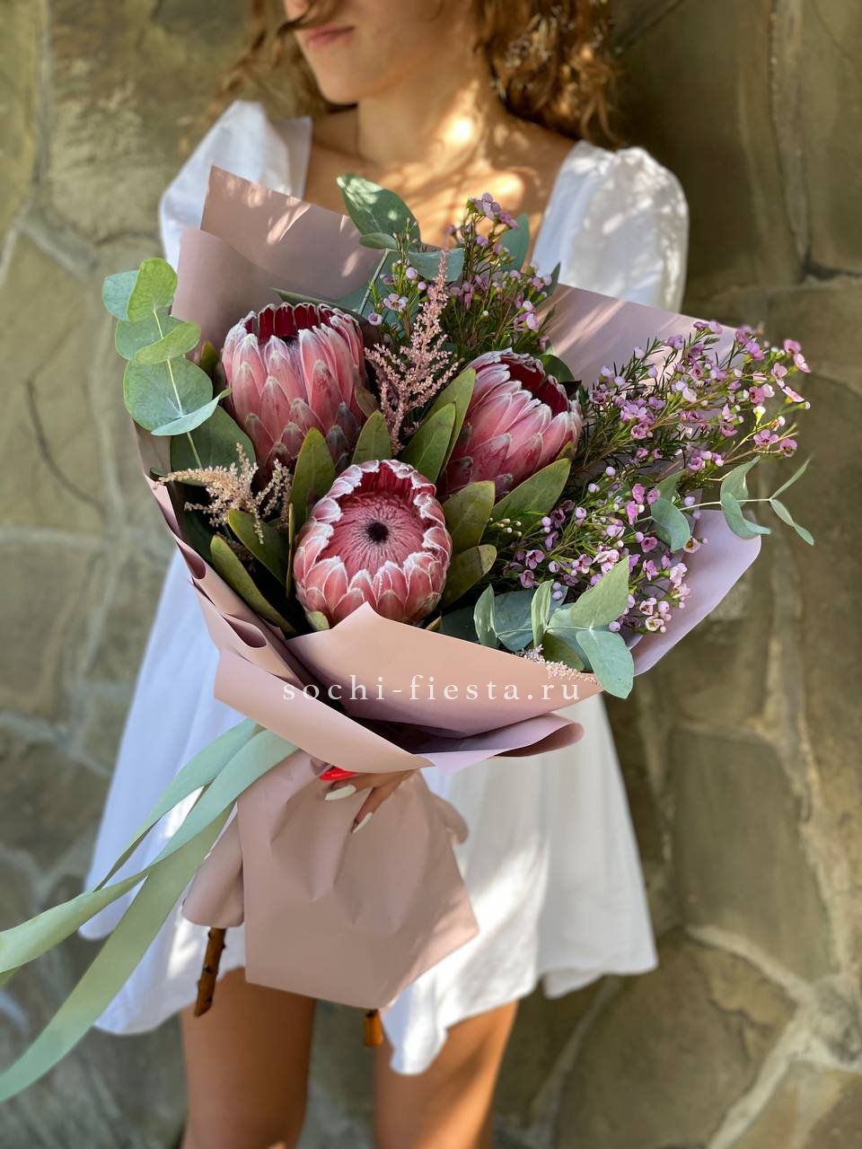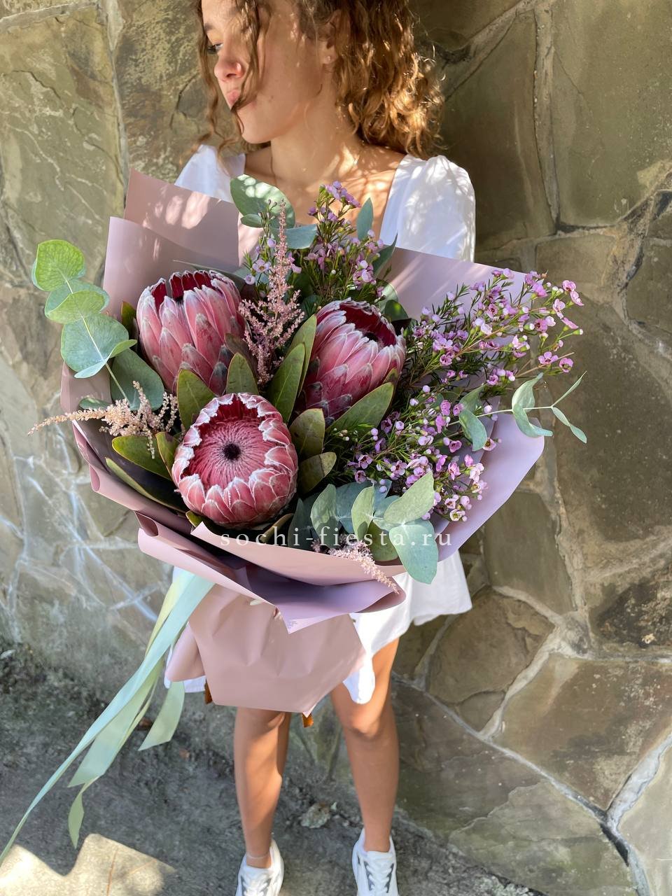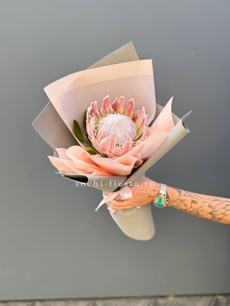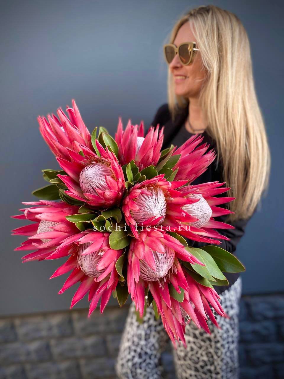 Экзотический цветок с плотной головкой и графичными лепестками привлекает внимание необычной архитектурой. Протея хороша в монобукетах и авторских композициях, где важна выразительная форма и долгая свежесть.