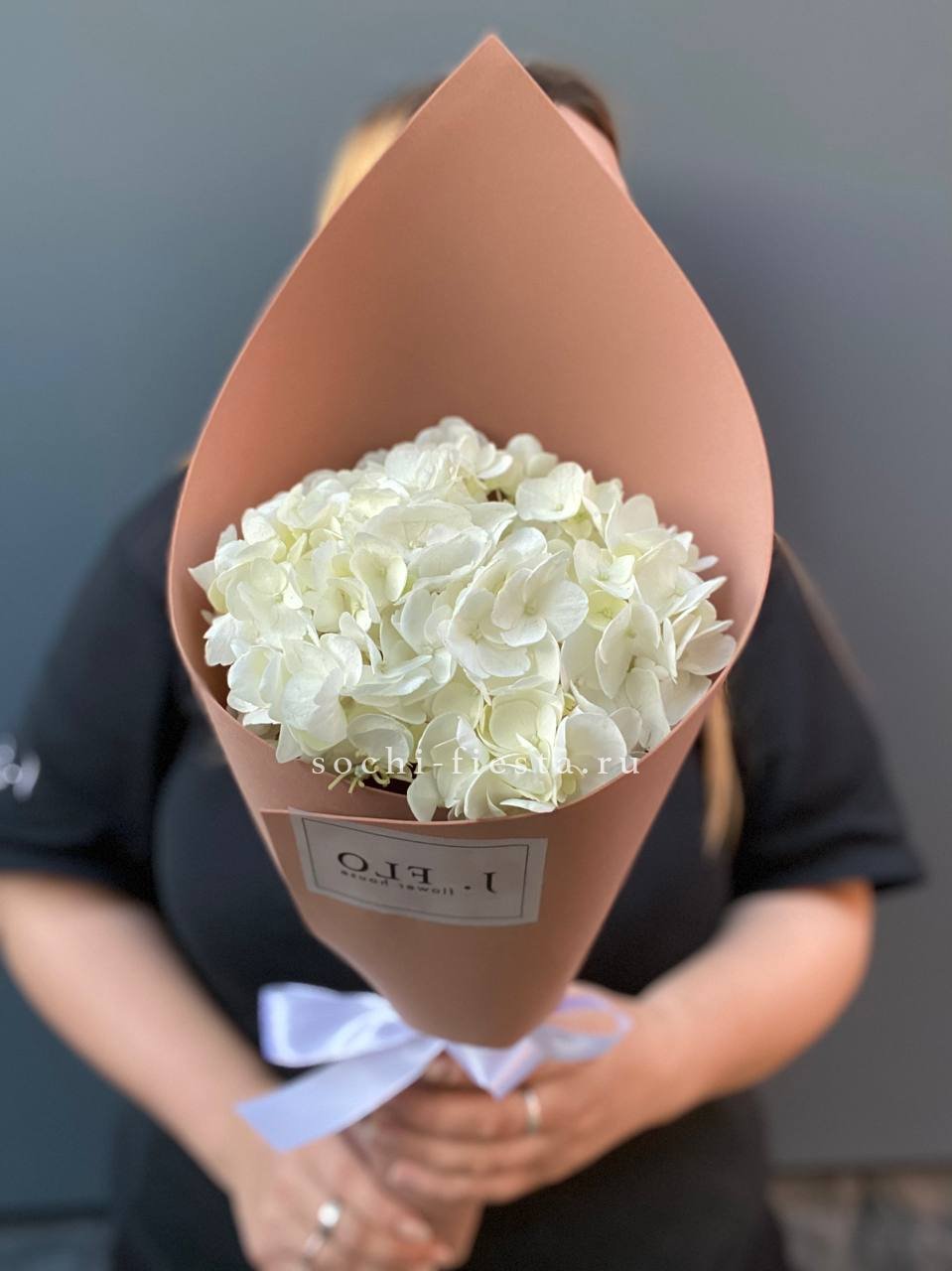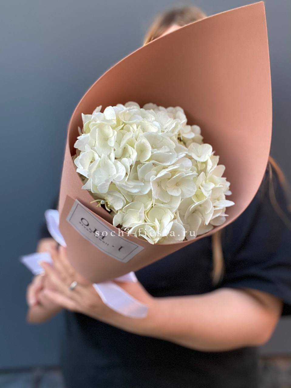 Белоснежное соцветие гортензии с плотной структурой и чистым тоном. Универсальный вариант для минималистичных интерьеров и спокойных решений.