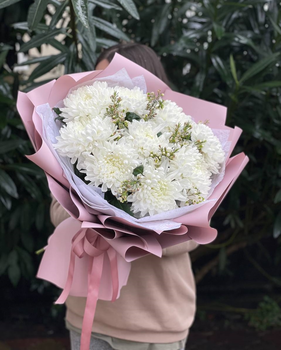 хризантема одноголовая - 9 шт., хамелациум, 5-7 шт., лента, дизайнерская упаковка.