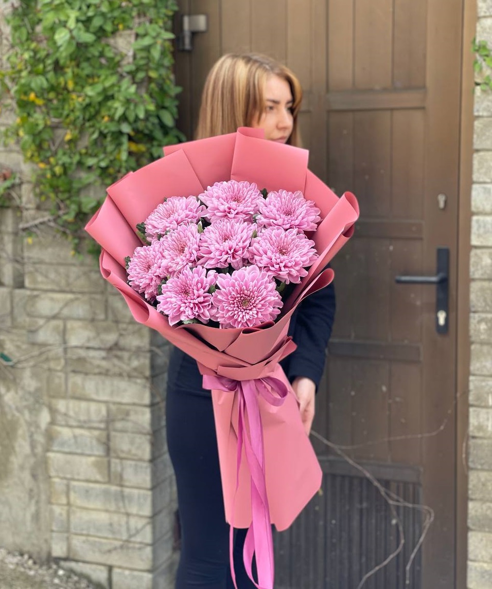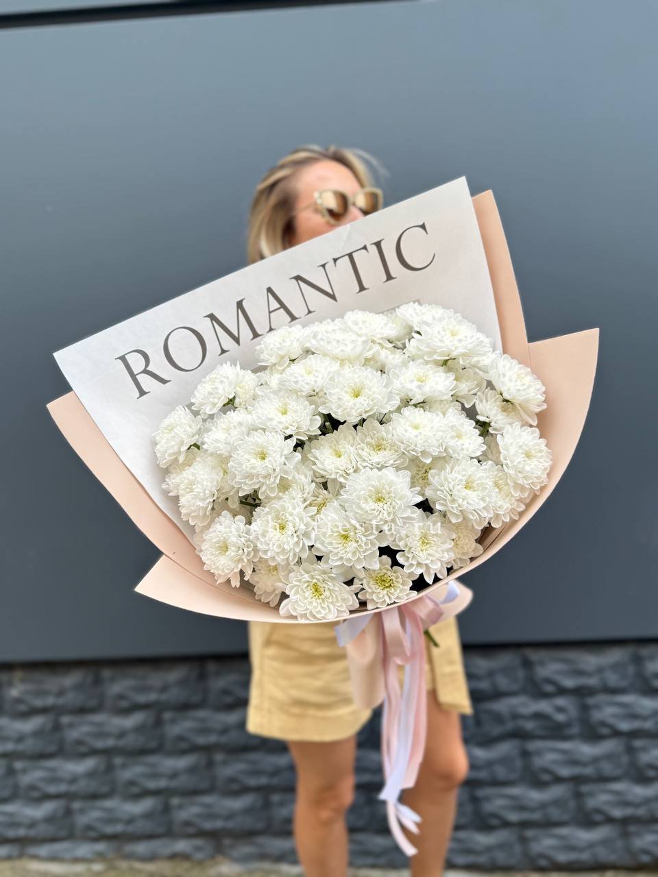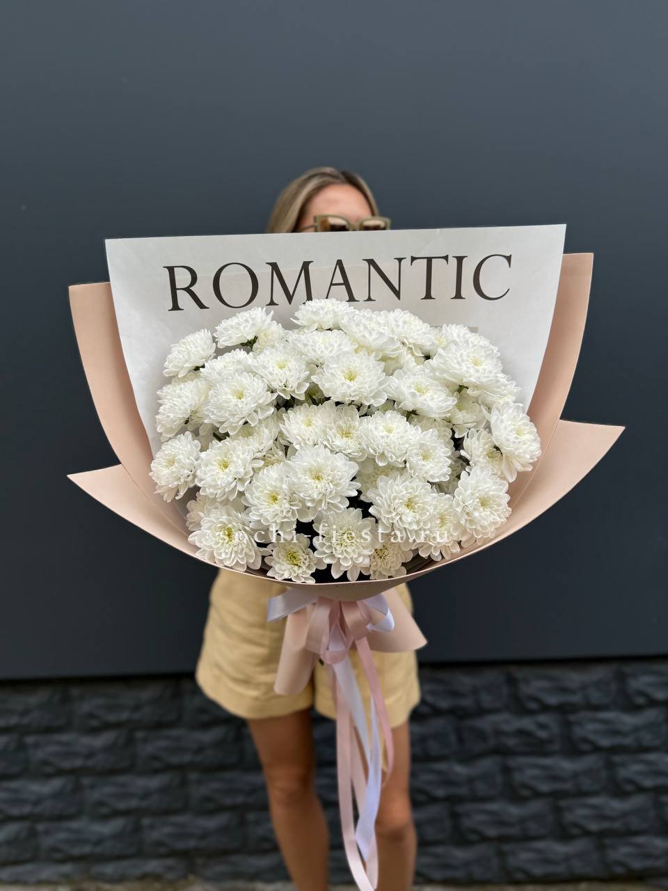 Семь хризантем собраны в плотную округлую форму и украшены бежевой упаковкой с тремя тонкими бантами. Сердечки на лентах добавляют композиции трогательности. Букет держит форму и выглядит аккуратно в руках или в вазе.