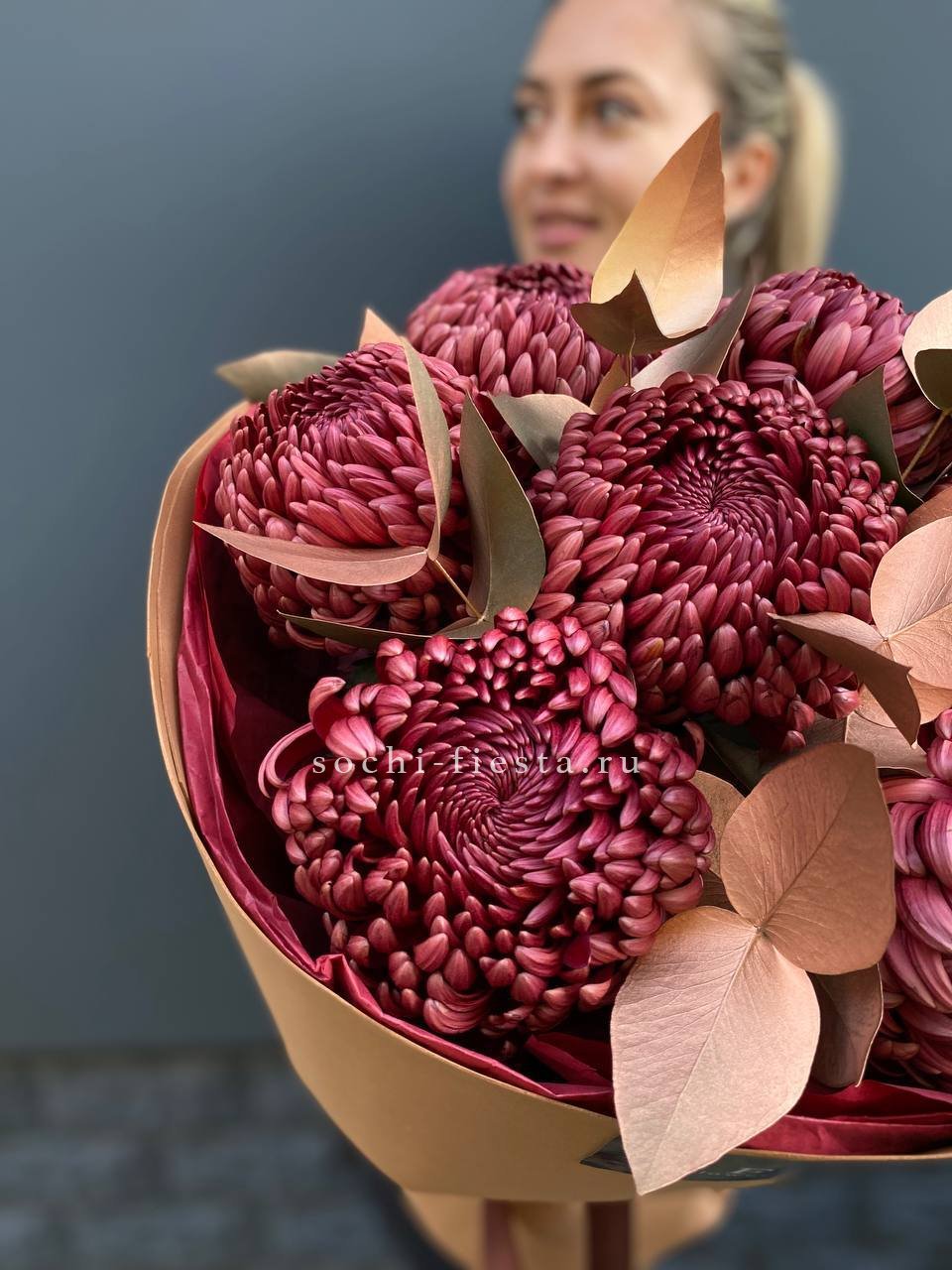 Теплый шоколадно-золотой оттенок хризантем создает уютное осеннее настроение. Семь пышных соцветий собраны в компактную композицию с веточками эвкалипта.