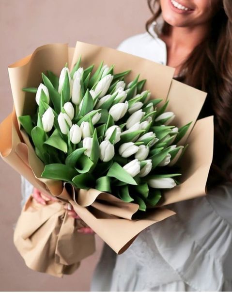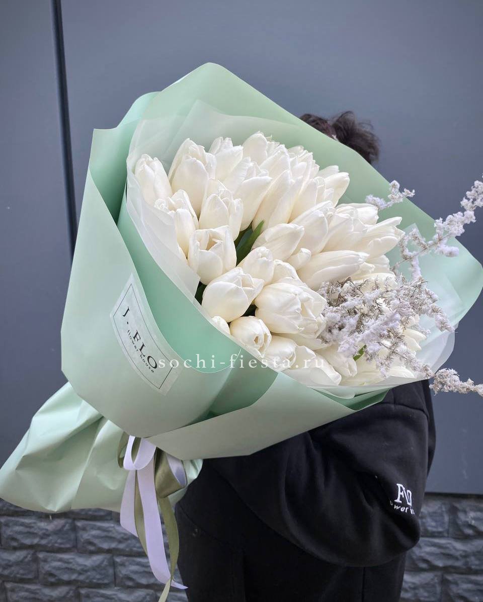 Плотная сборка из 39 белых бутонов с лёгкими нитями амаранта создаёт объёмную вертикальную форму. Белоснежные головки тюльпанов образуют упругий купол с чётким ритмом.
