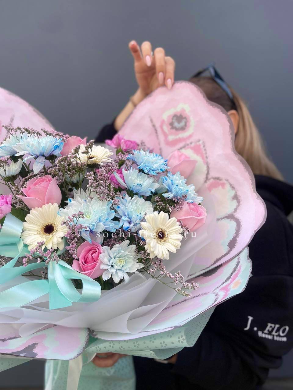 голубая хризантема, розовые розы, герберы, диантусы, лимониум, лента и дизайнерская упаковка бабочка.
