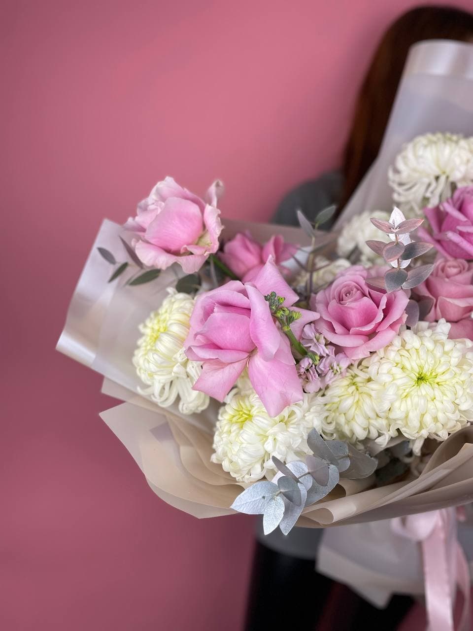 хризантемы, розы, маттиола (или аналог), вспомогательная зелень, эвкалипт, дизайнерское оформление.
