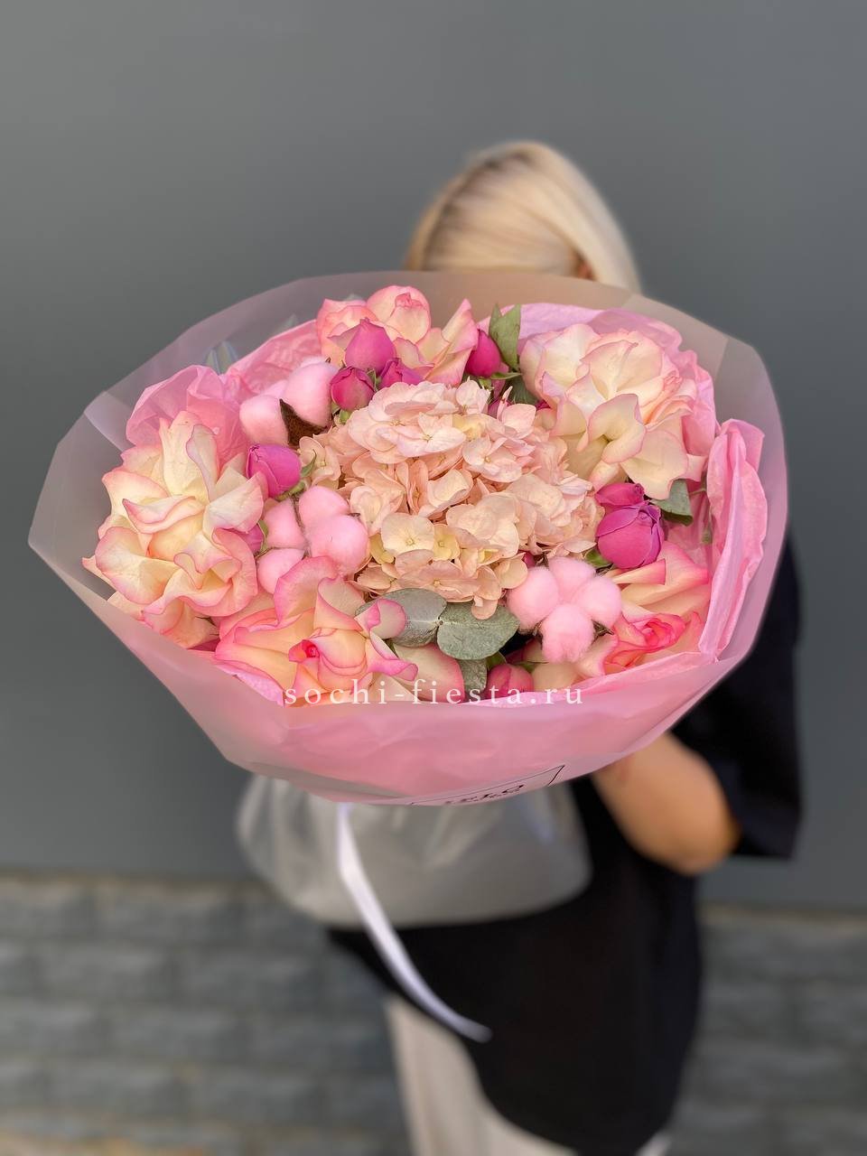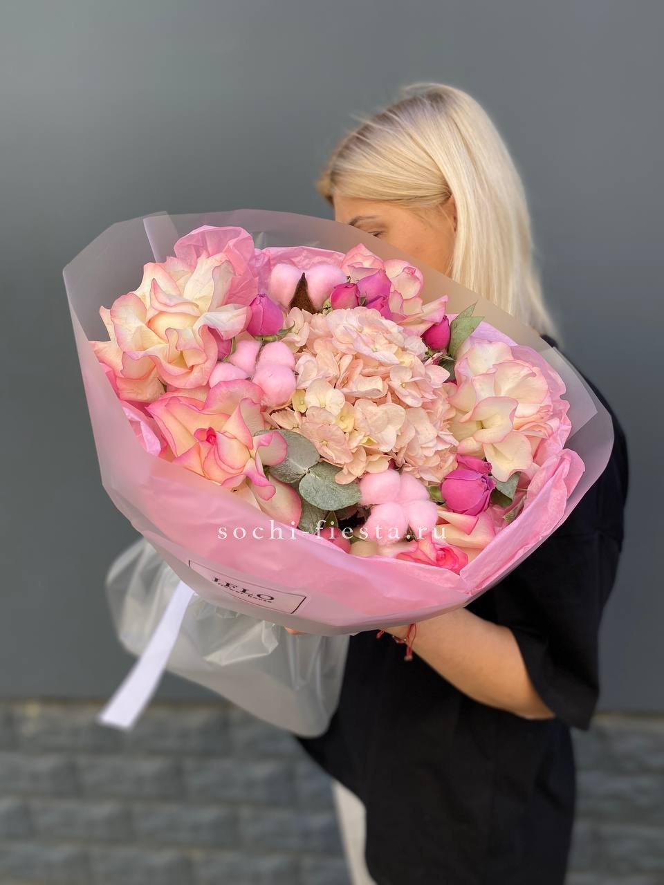 гортензия, эустома, кустовая роза, маттиола (или львиный зев), роза одноголовая, каллы (или аналог), эвкалипт, лента, упаковкаСостав букета в несозон может нести незначительные изменения.
