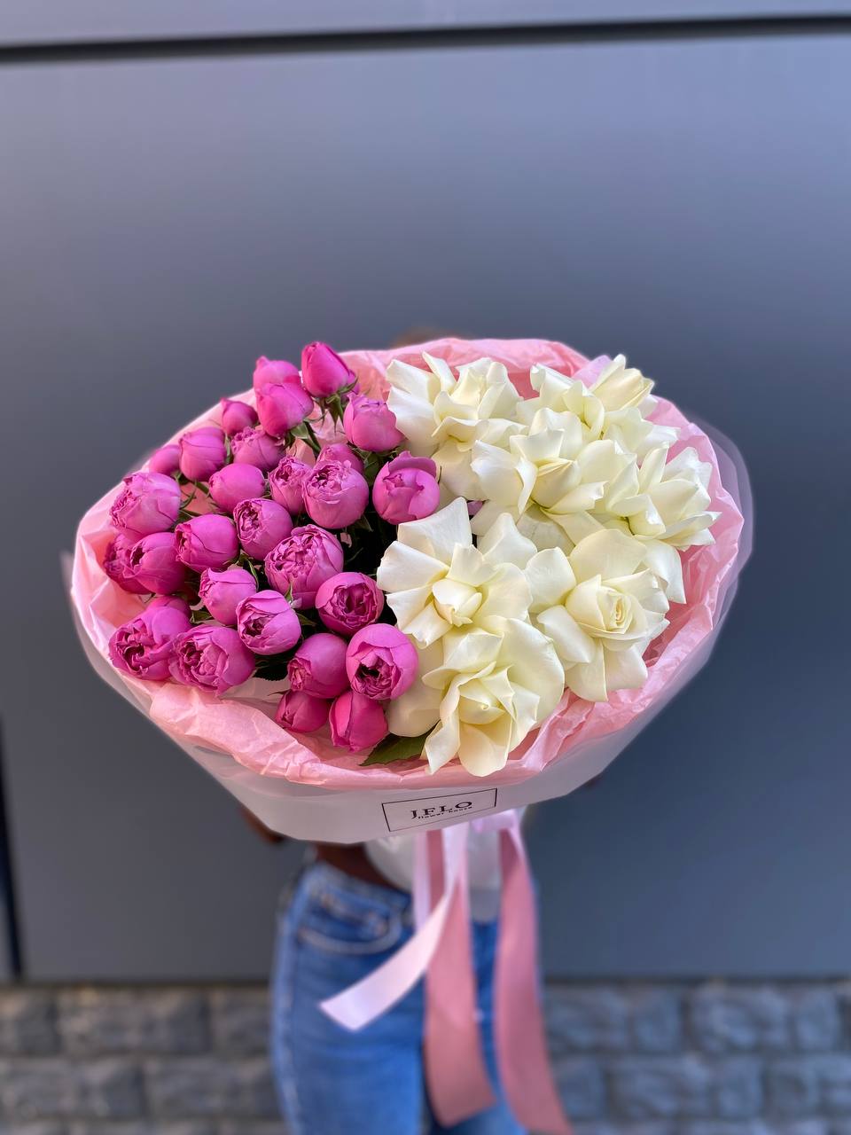 Пионовидные бутоны мисти баблс раскрываются мягкими волнами, создавая объёмную текстуру рядом с классическими белыми розами. Букет построен на игре плотности: пышные головки чередуются с точёными силуэтами, собирая взгляд к центру композиции.