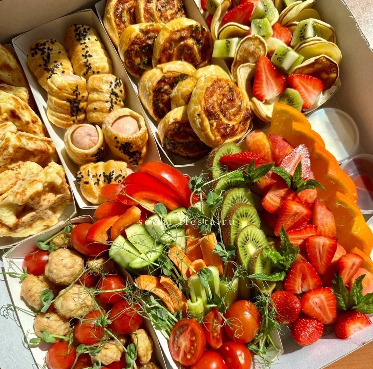 брускетта с голубым сыром и карамелизированной грушей- 3 шт.,  брускетта Цезарь- 3 шт., брускетта сырная с манго-маракуйя- 3 шт.