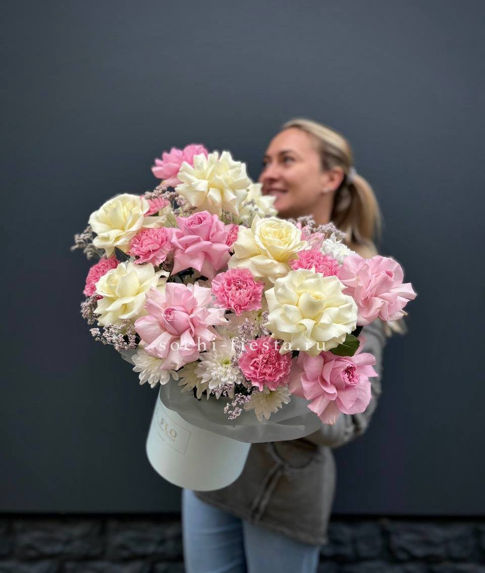 Для заказа товара "Коробка французских роз и диантусов "Бони"" с доставкой в Тольятти нажмите в корзину