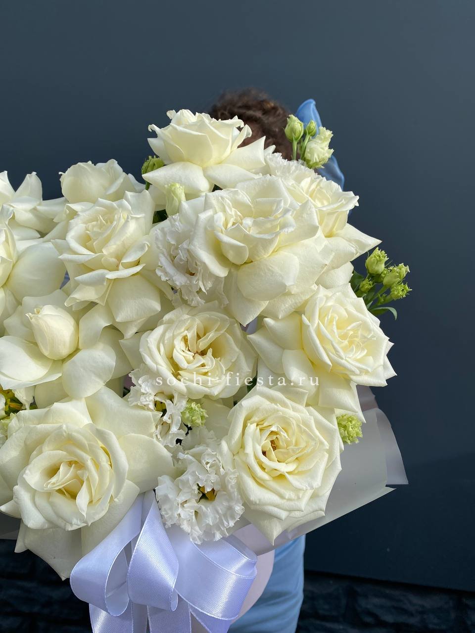 Белые розы и эустома образуют монохромную гамму с чистыми линиями. Эвкалипт добавляет свежести и завершает лаконичную форму композиции.