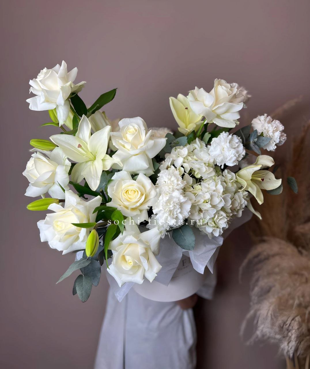 бокс 16, гортензия, роза, эустома, лилия, статица, лагурус.