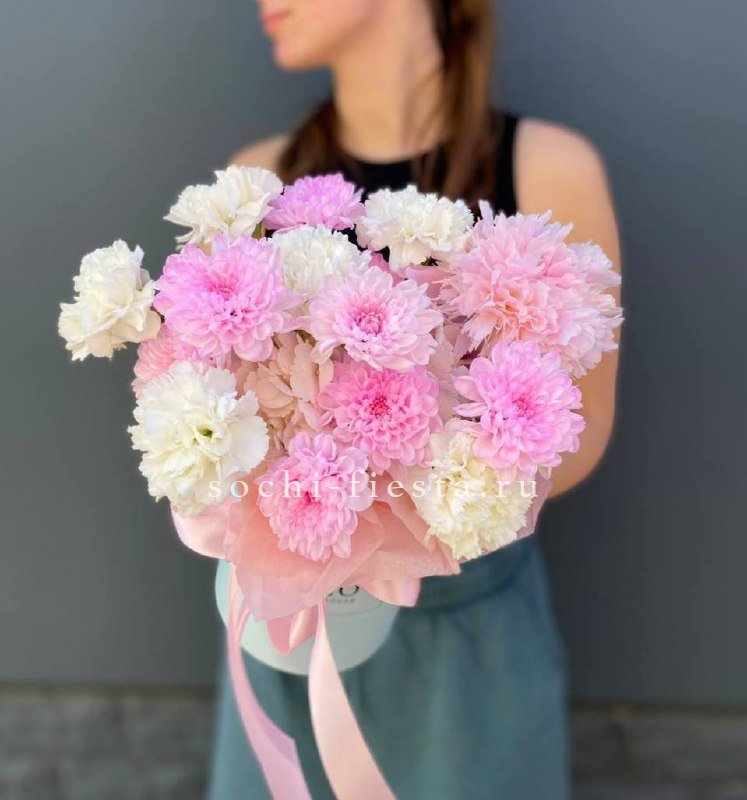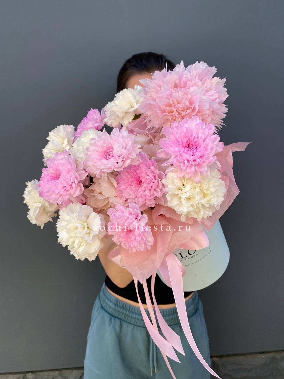 Композиция объединяет живые хризантемы и диантусы с ароматическим диффузором. Цветы сохраняют свежесть долго, а аромат наполняет пространство мягким шлейфом.