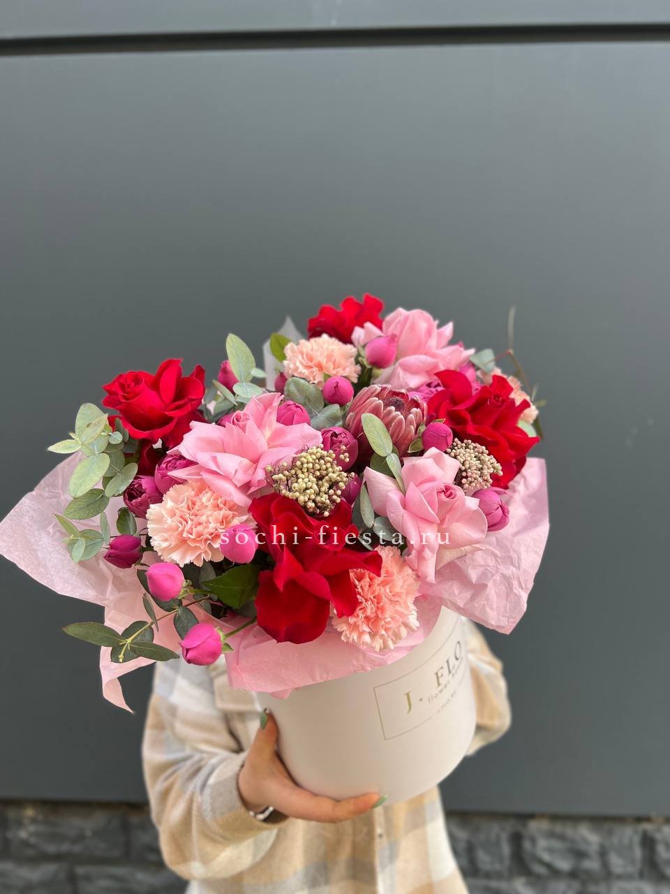 композиция из роз, протеи, диантусов, мисти баблс, озотамуса с эвкалиптом.