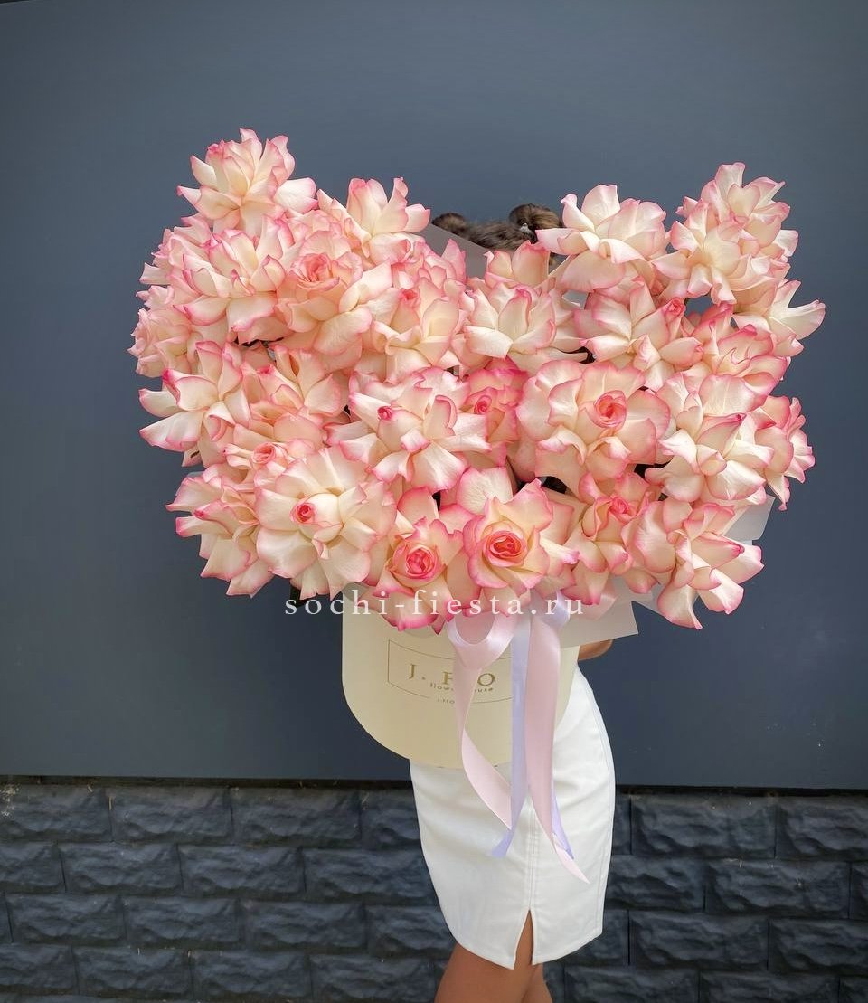 Пионовидная роза Бомбастик образует плотные бутоны с множеством лепестков. Эвкалипт добавляет свежести и завершает форму. Компактная коробка удобна для передачи из рук в руки.