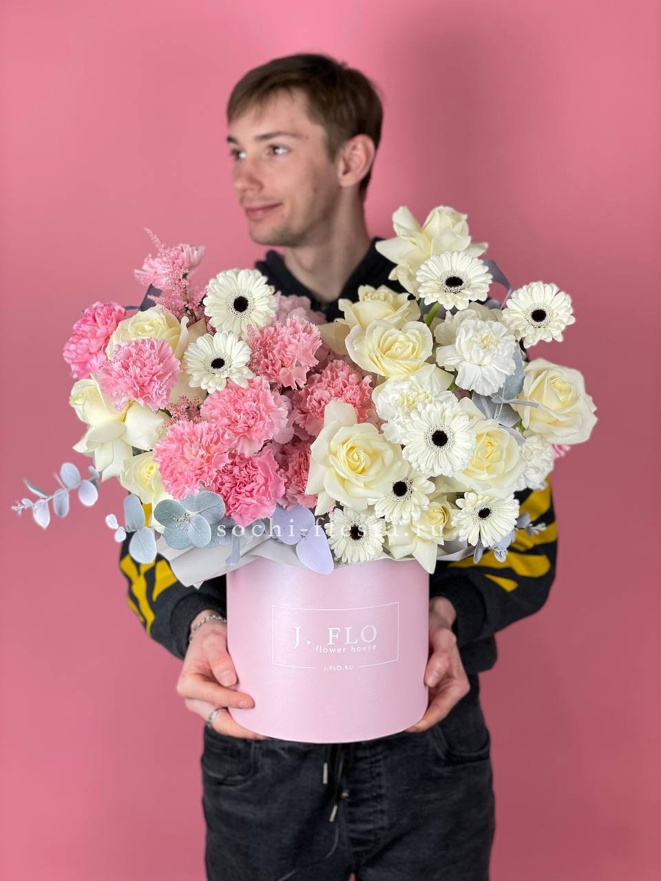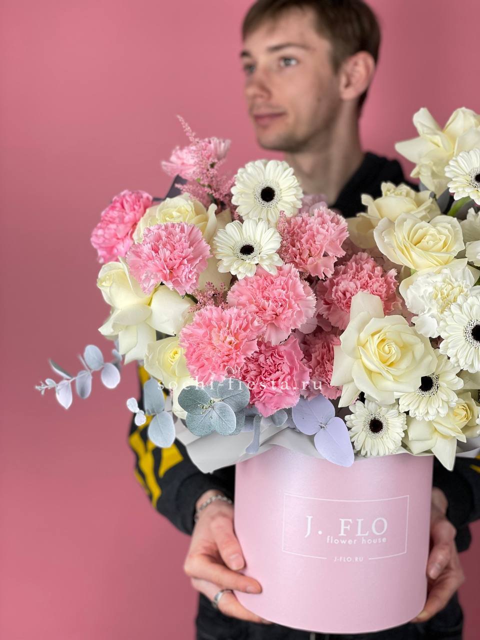 выполнен из эустом, французских роз, эвкалипт, цилиндр D20.