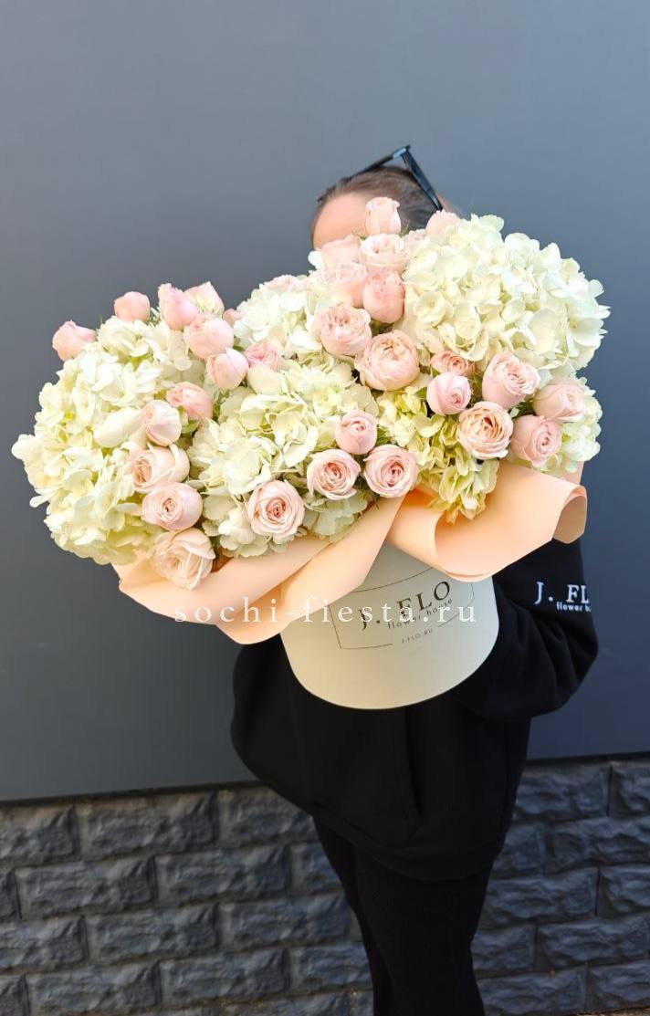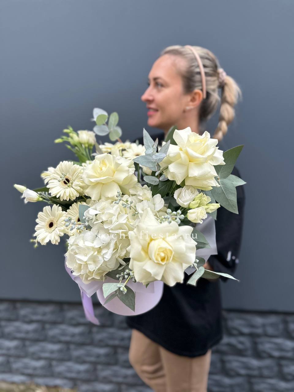 вывернутые белые розы, цилиндр D20, эвкалипт, лента, упаковка.