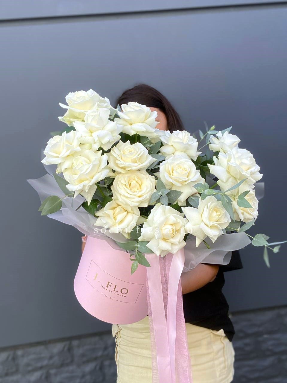 Семнадцать белых роз с раскрытыми лепестками собраны в круглый бокс с добавлением эвкалипта. Композиция держит форму и легко размещается на столе или комоде. Практичное решение для тех, кто ценит аккуратность и свежесть без лишних деталей.