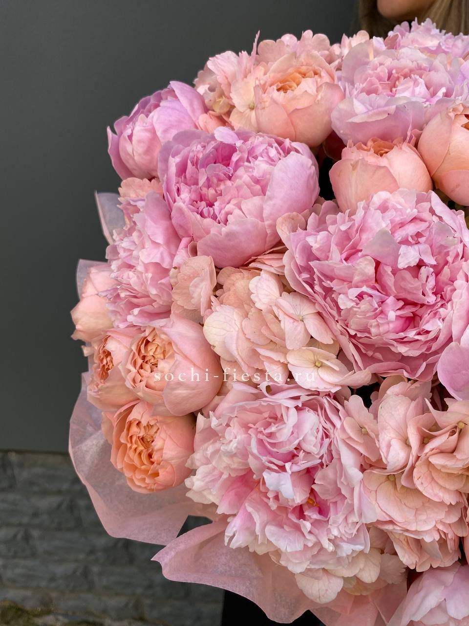 гортензии, пионы,кустовые пионовидные розы, амарант, цилиндр D 20,  бумага тишью.