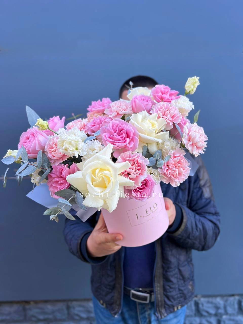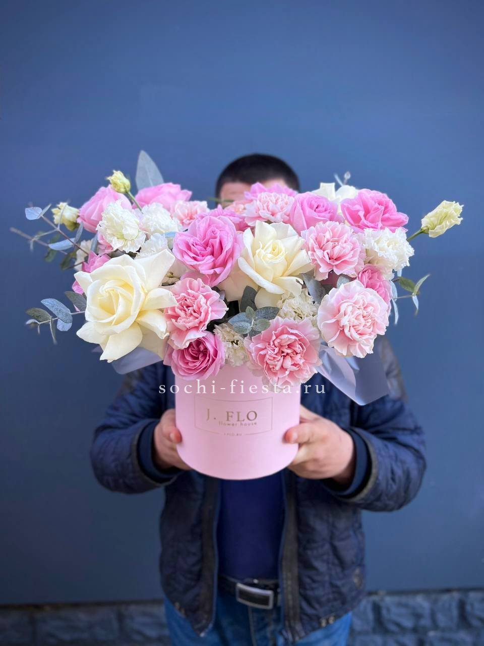 Пионовидные кустовые розы формируют плотный купол с мягкими переходами оттенков. Каждый бутон раскрывается слоями, создавая объёмную текстуру. Эвкалипт добавляет свежести композиции в цилиндре.