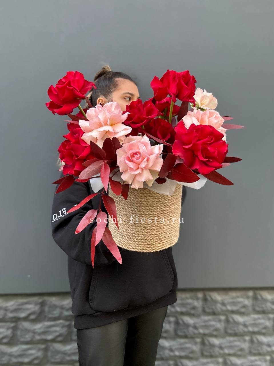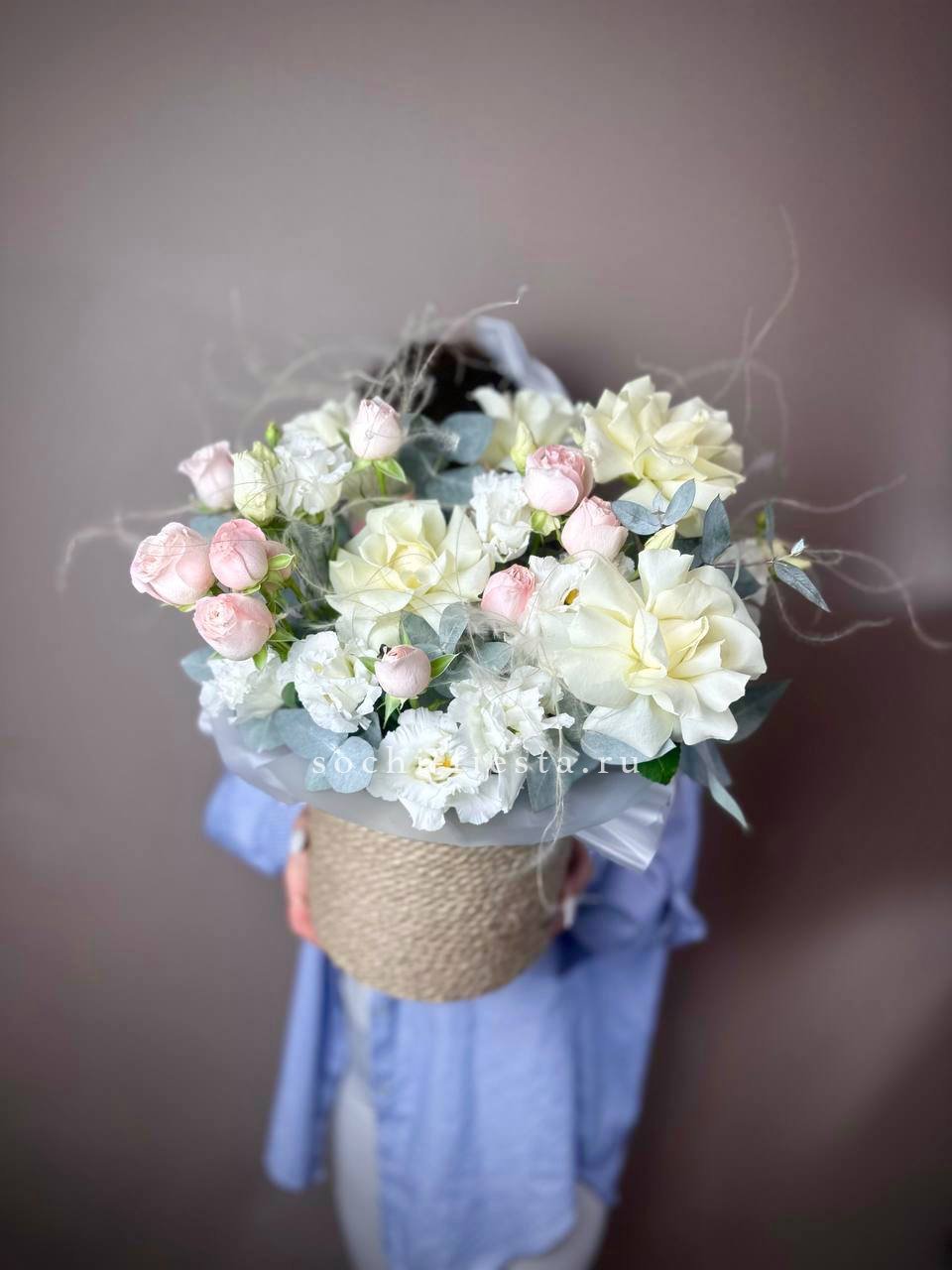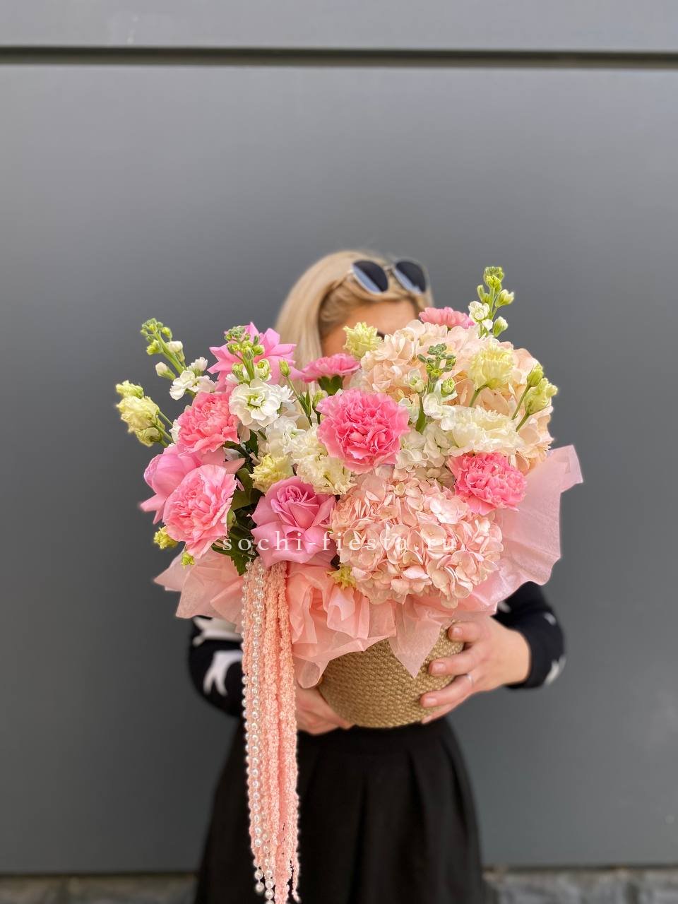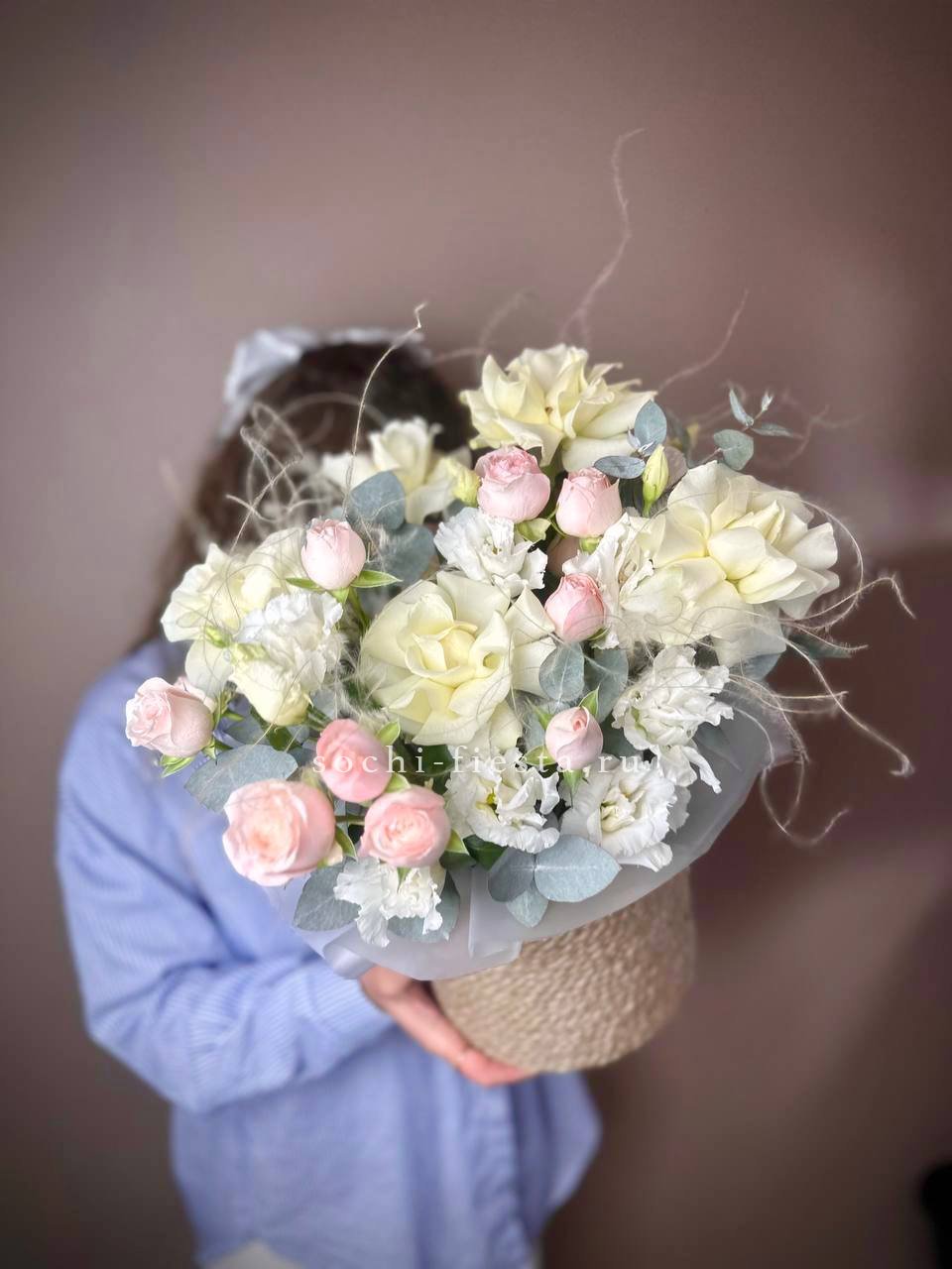 розовые розы, пионовидные кустовые, эустома, ранункулюс (возможна замена в зависимости от сезонности) в джутовом кашпо с элементами бус и перьев.