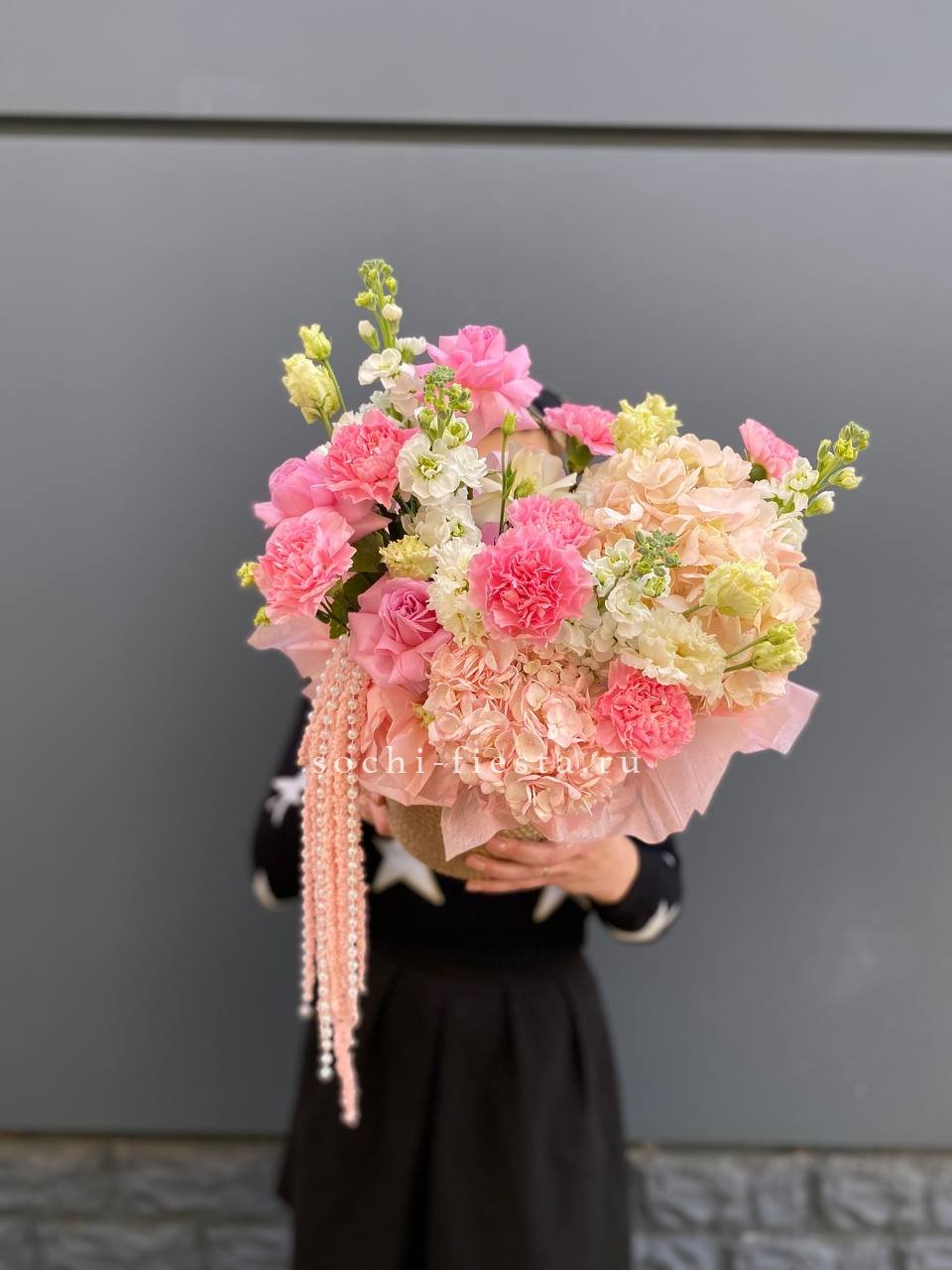 Розовые розы и пионовидные кустовые создают пышный объем, дополненный ранункулюсами и эустомой. Декоративные бусы и перья придают композиции театральность, словно застывший момент балетного выступления.