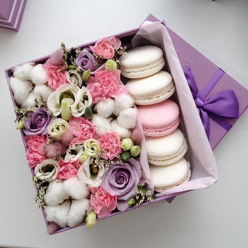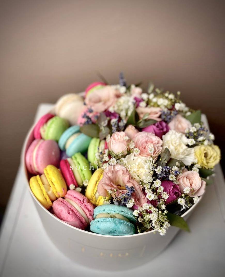 Пионовидные розы Мисти Баблс и Бомбастик образуют пышную фактуру с многослойными лепестками в розовой коробке. Шесть макаронс гармонично встраиваются в общий колорит композиции.
