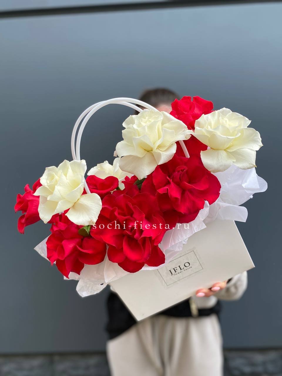Сумочка Florence дарит ощущение солнечного утра. Альстромерии и розовые розы собраны в легкую композицию с добавлением хлопка и диантусов. Удобная форма позволяет разместить её на столе или подоконнике.