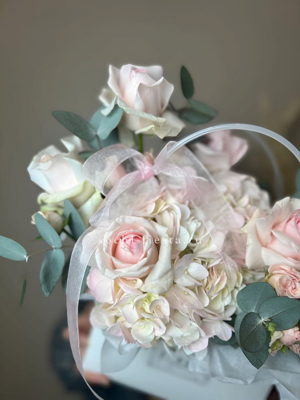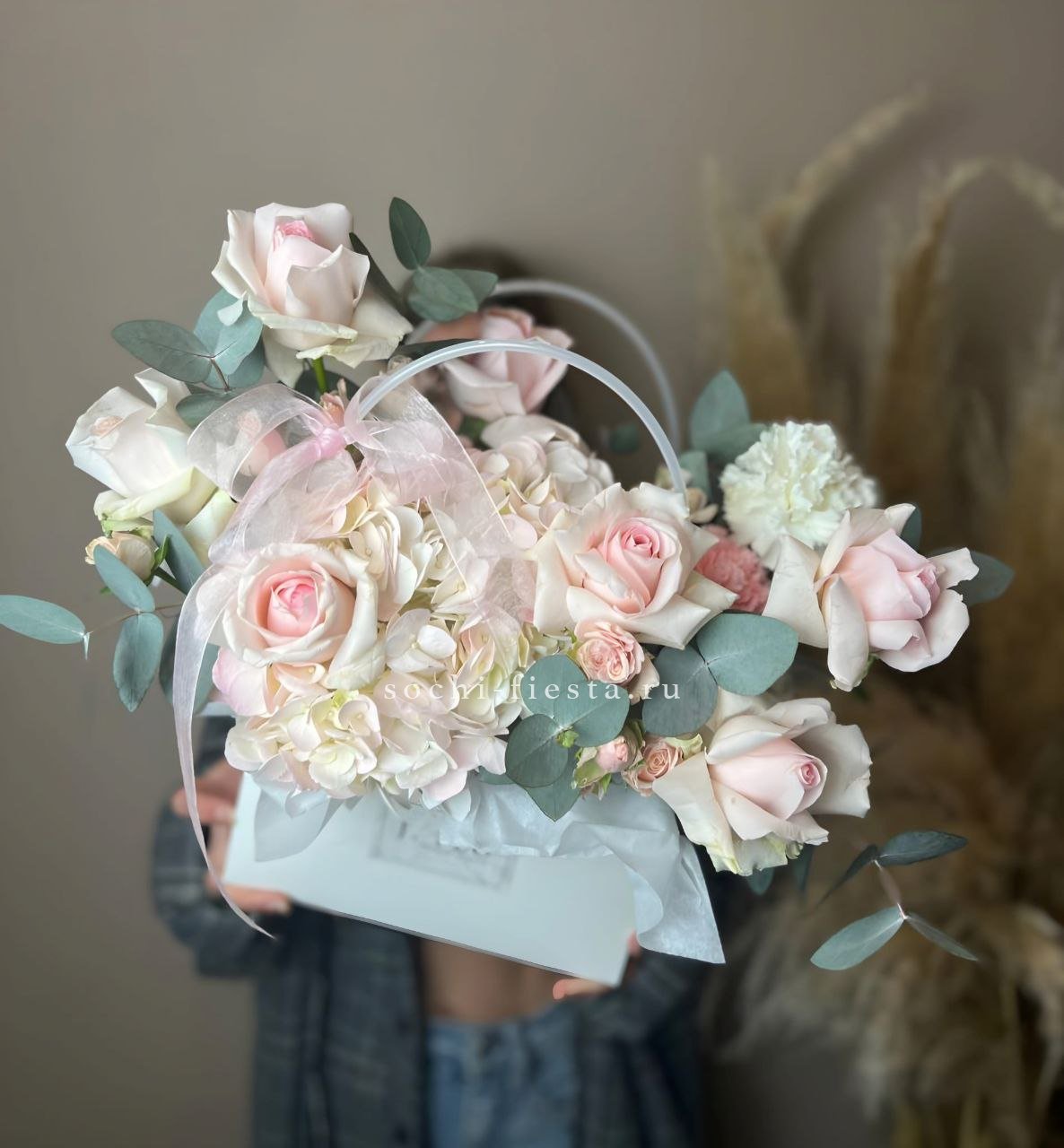 Голубая гортензия задает тон всей композиции, а яркие герберы и диантусы добавляют живости. Компактная форма в сумочке удобна для вручения и не требует вазы.