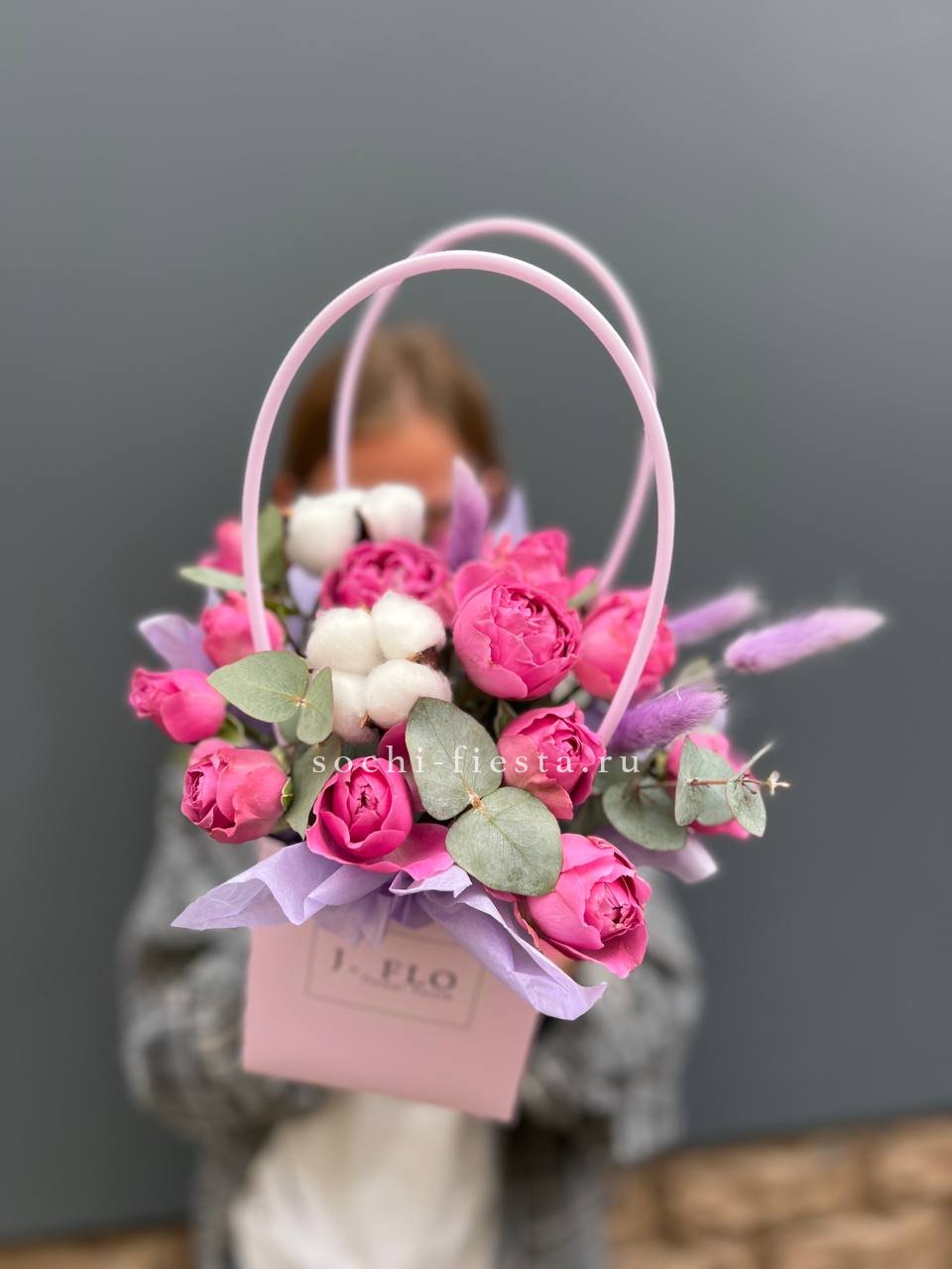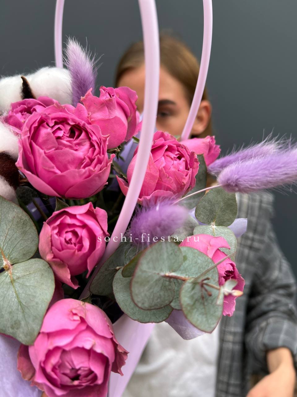 Состав выполнен из пионовидных роз мисти, хлопка, эвкалипта, оформления. Данная цена доступна при единовременном заказе от 10 шт.