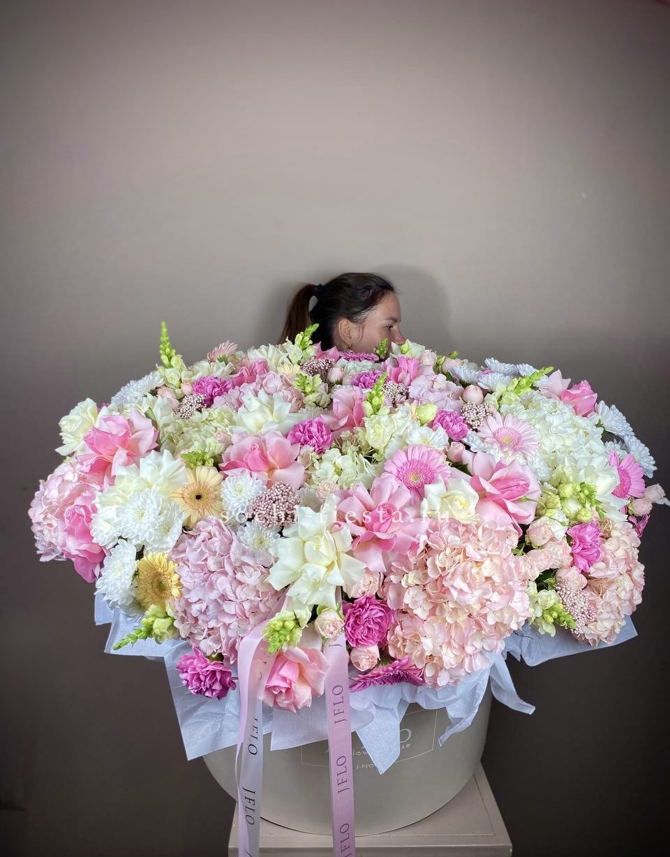 Восемь видов цветов складываются в harmonичную композицию со светлой корзиной в основе. Диантусы и эустома перекликаются с розами, а гортензия задает мягкий объем всей структуре.