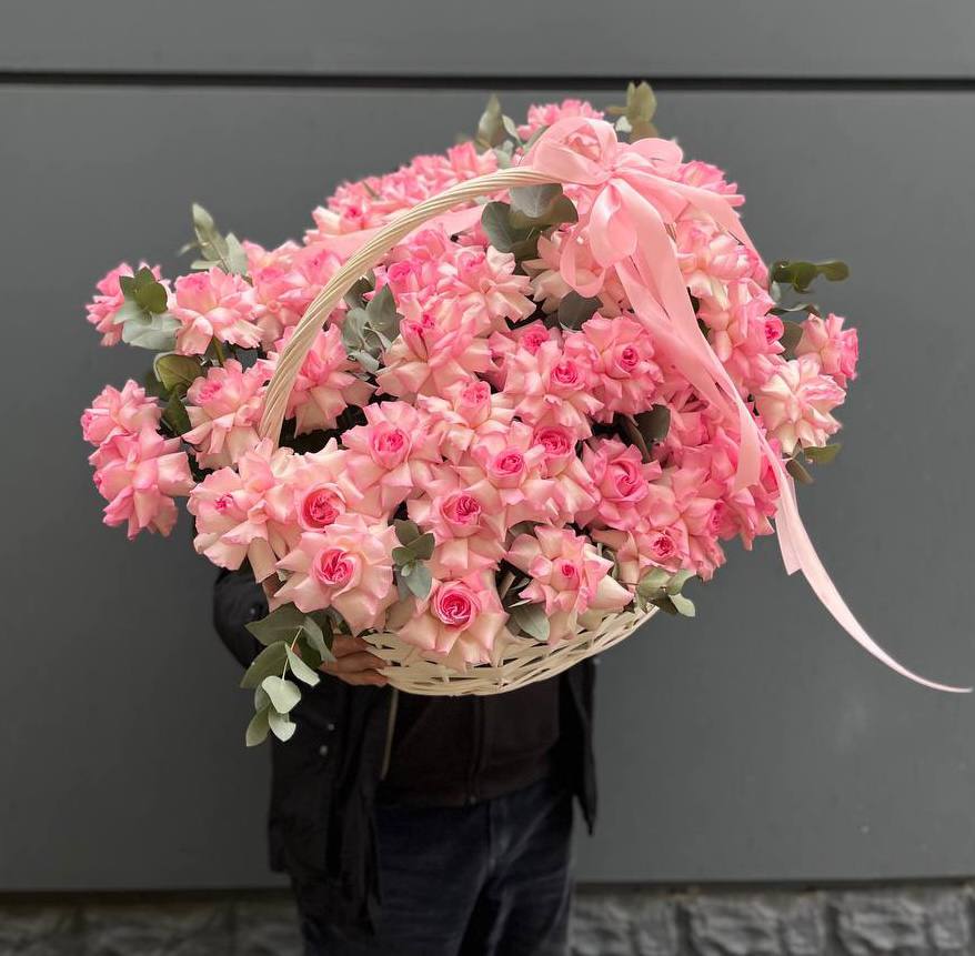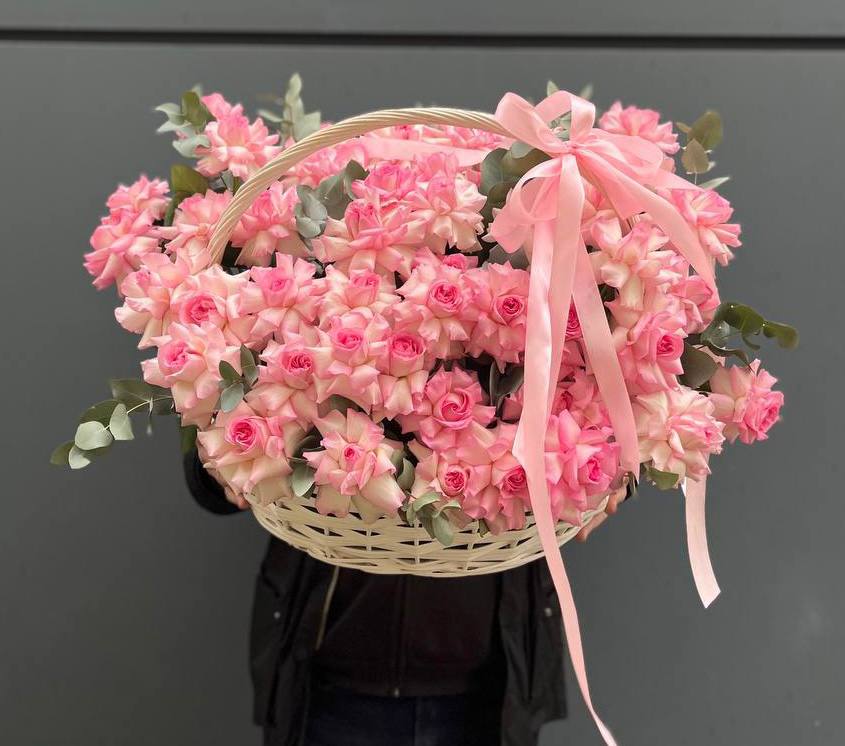 розы, эустома, гортензия, бомбастик, маттиола ( или аналог), эвкалипт, корзина.