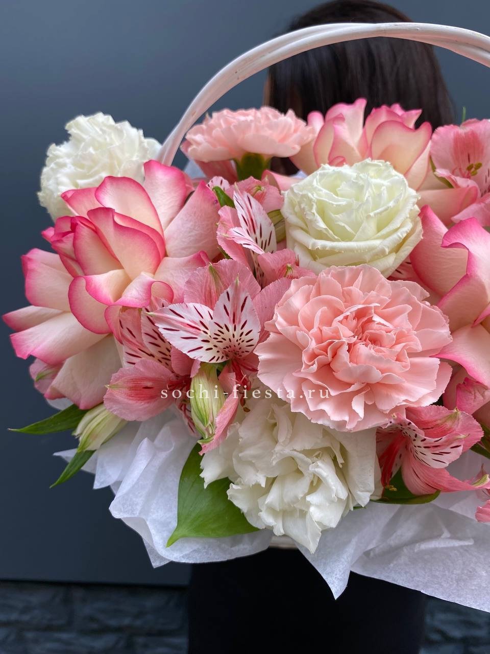 цветочная корзина с розами, мисти баблс, диантусами и гортензией.