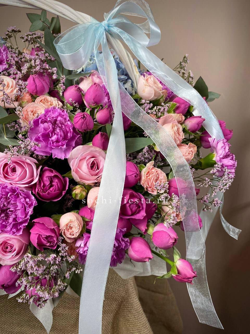 гортензия нежно-розовых оттенков, эустома, пионовидная кустовая роза, эвкалипт, диантус, антиринум, розы, лента, корзина.