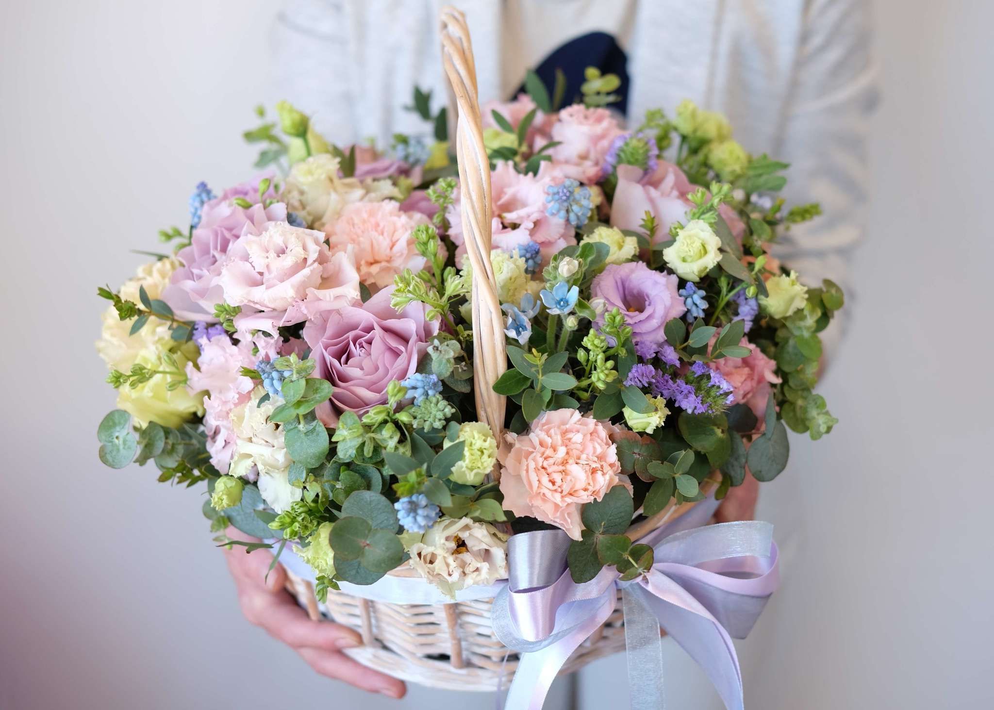 Солнечная мимоза встречается с тюльпанами и пионовидными розами Мисти Бабблс. Весенняя палитра собрана в корзине, где каждый цветок занимает свое место в общем ритме.