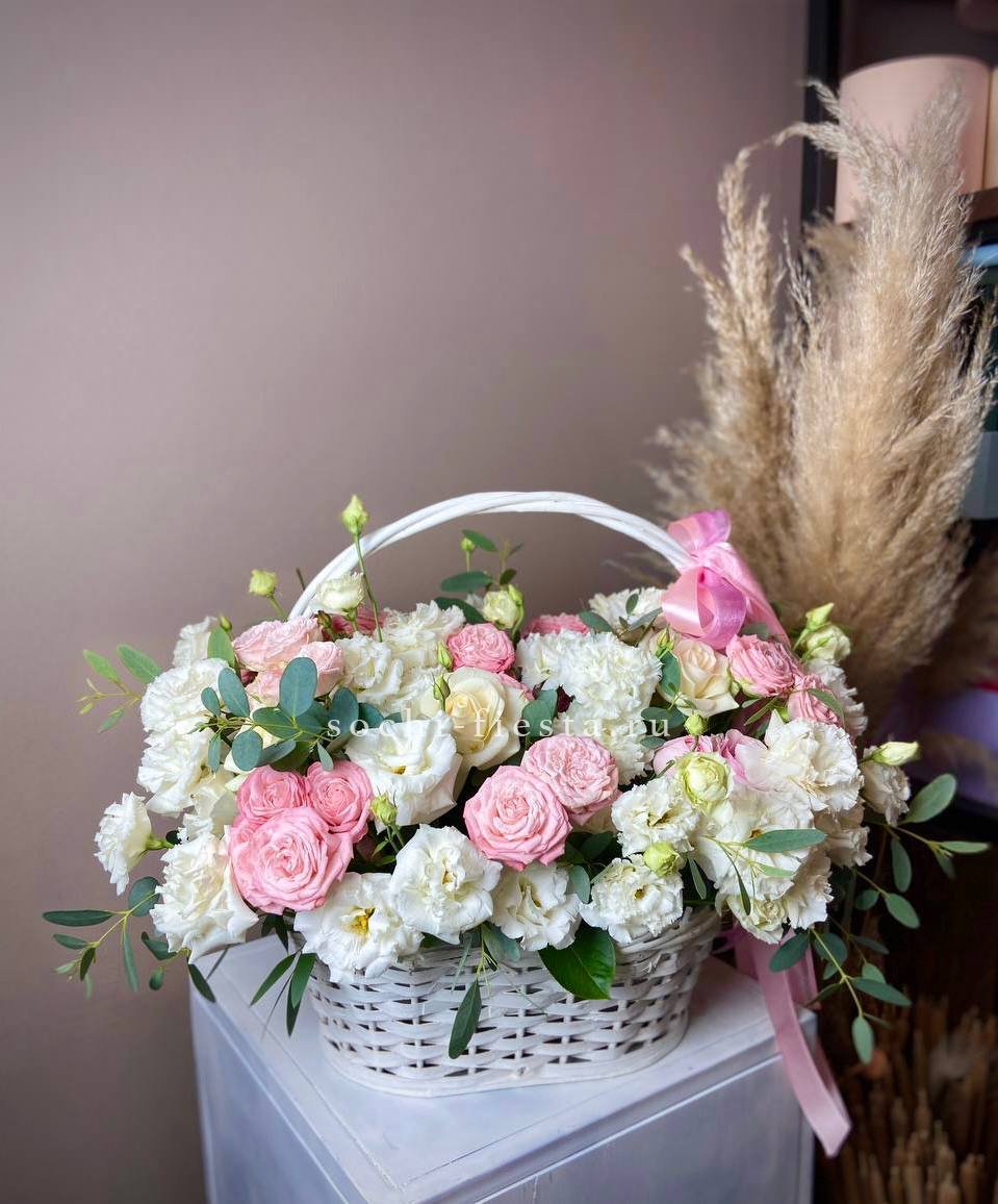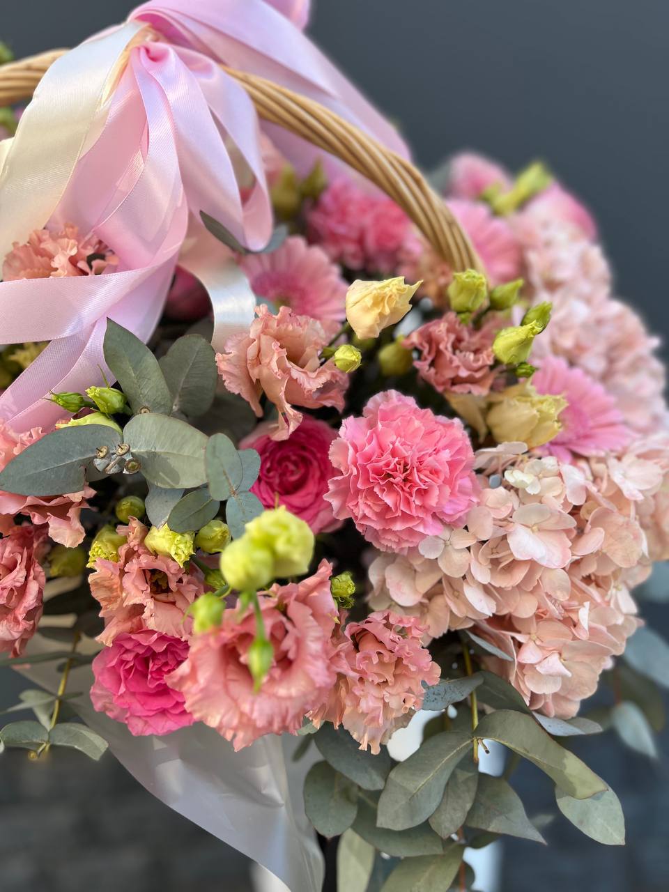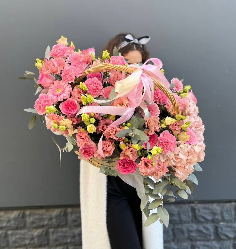 Пышная корзина объединяет пионовидные розы с воздушной гортензией и многослойной эустомой. Матиолла и лимониум добавляют глубину композиции, а диантус создает мягкие переходы между крупными бутонами.