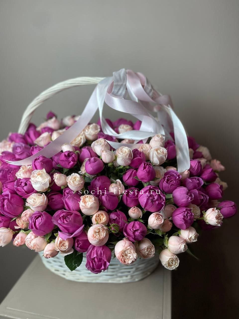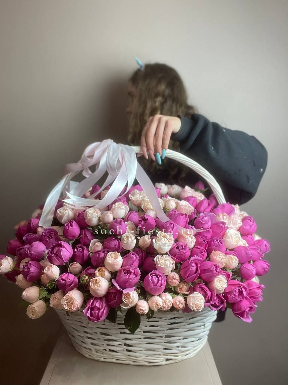 Белые розы и эустома образуют воздушную композицию с мягкими переходами между соцветиями. Хризантемы и маттиола добавляют объема, а гипсофила создает легкую дымку по краям. Корзина выглядит свежо и собранно в любом пространстве.