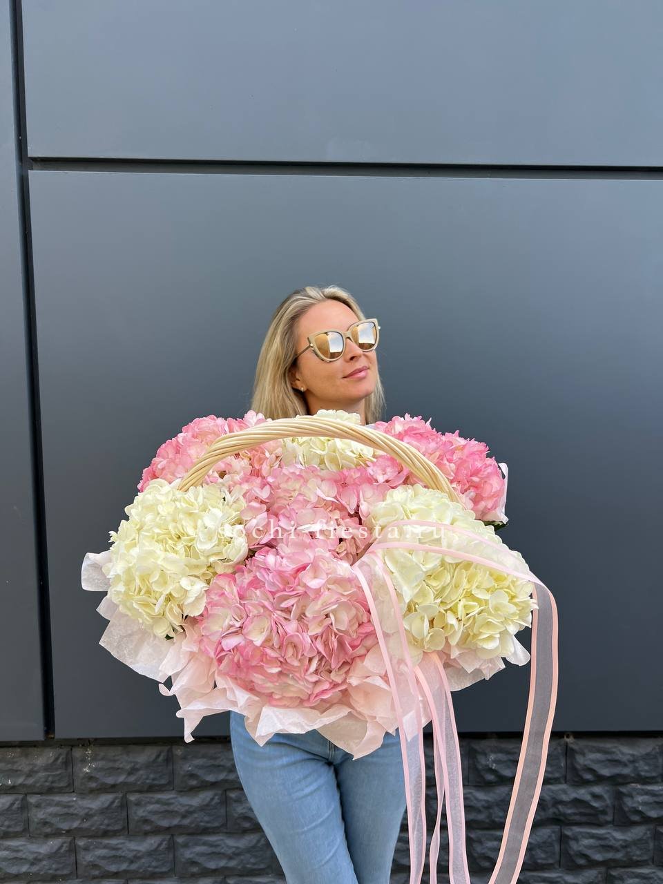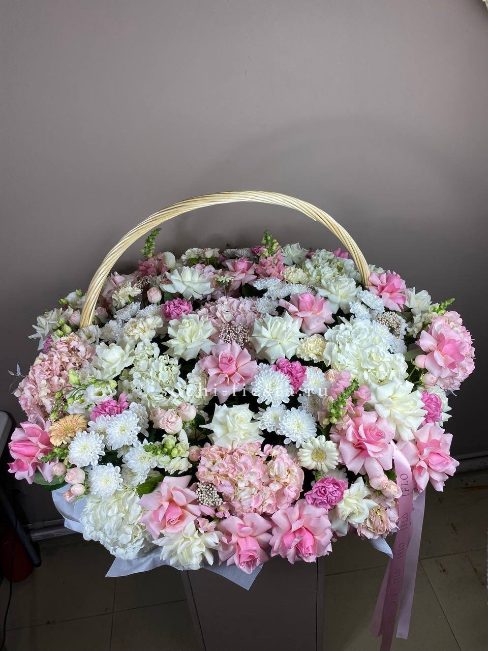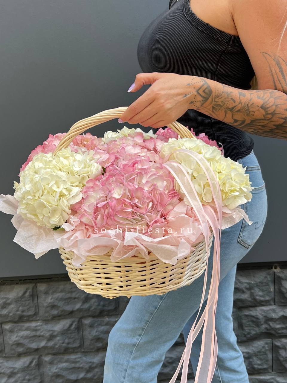 гербера, гортензия, диантус, хайди, эустома, эвкалипт, корзина средняя.