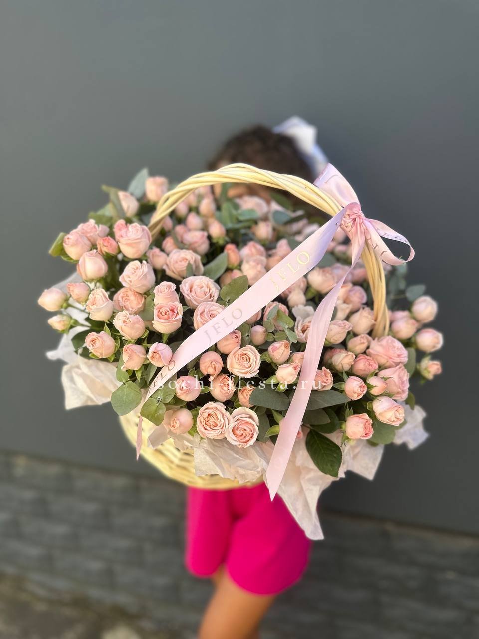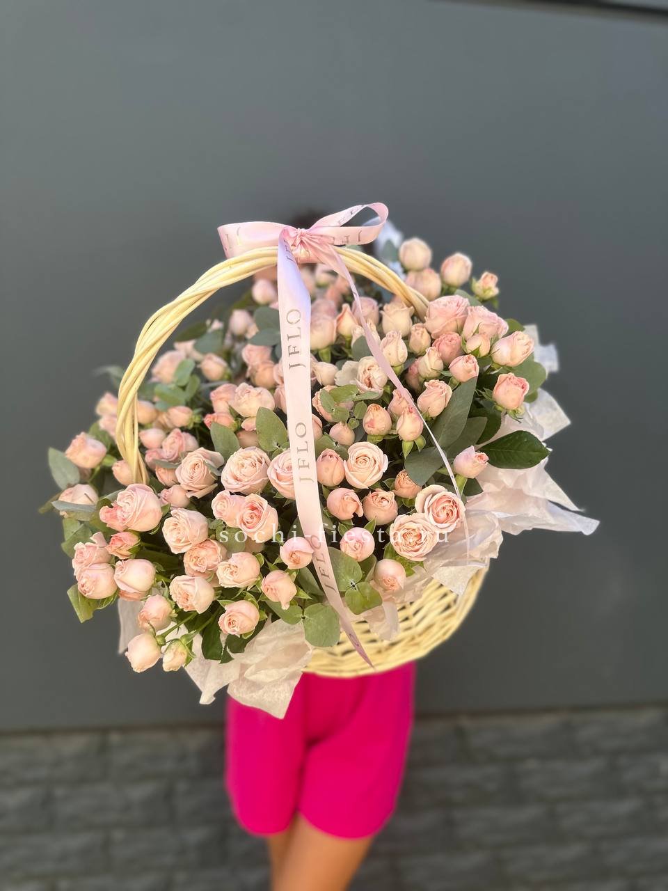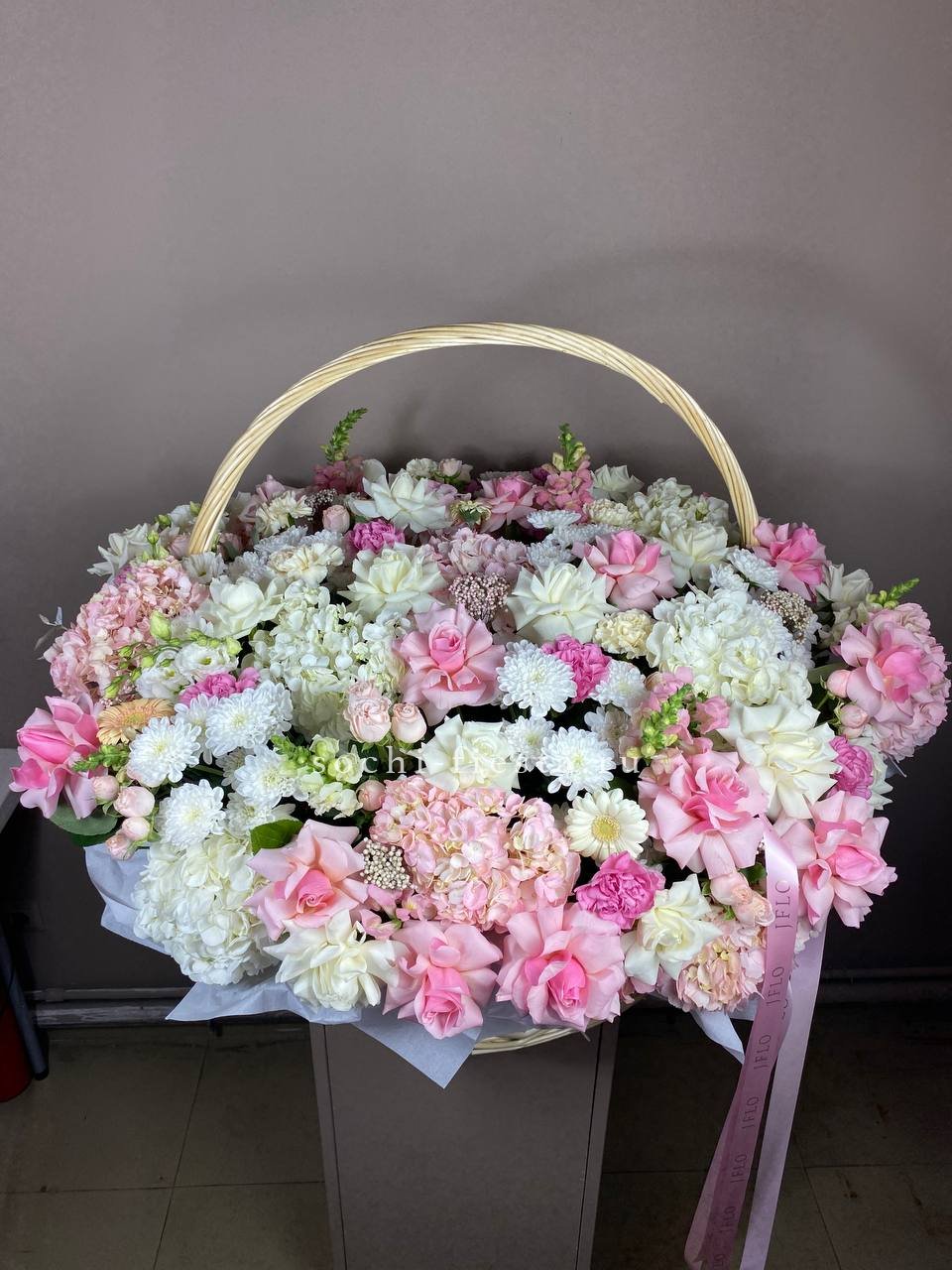 Гортензия и эустома задают объём, а яркие герберы расставляют цветовые акценты по всей композиции. Диантус и хайди добавляют воздушности, эвкалипт завершает силуэт мягкими линиями. Корзина держит форму и создаёт устойчивую основу для пышной композиции.
