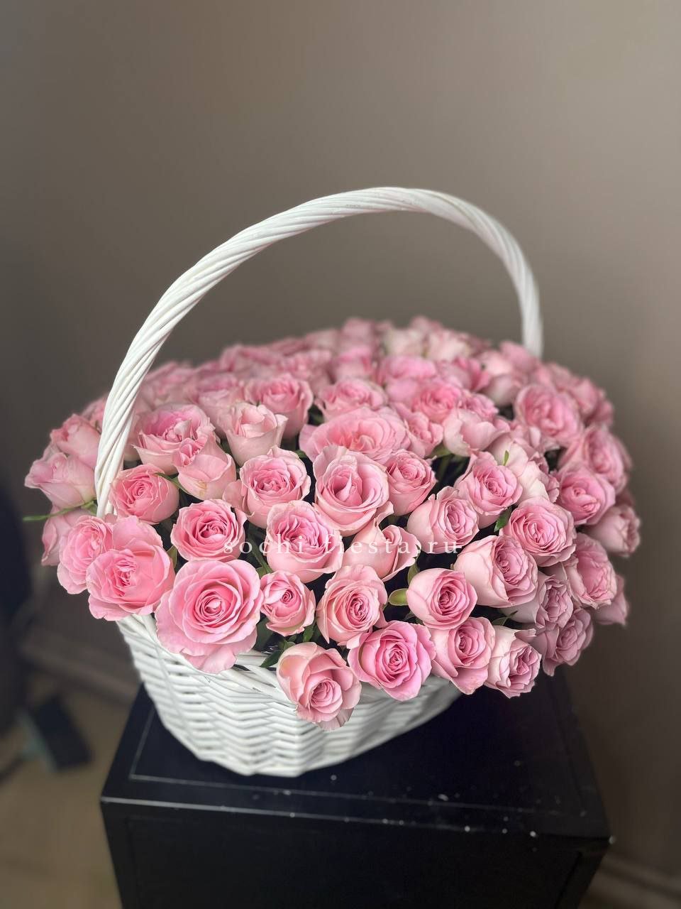 Композиция в плетёной корзине собрана из роз, эустомы, гортензии и диантуса с добавлением воздушного мисти баблс. Каждый цветок находит своё место в общем ритме, создавая гармоничную картину. Готовое решение для дома или в подарок близким.