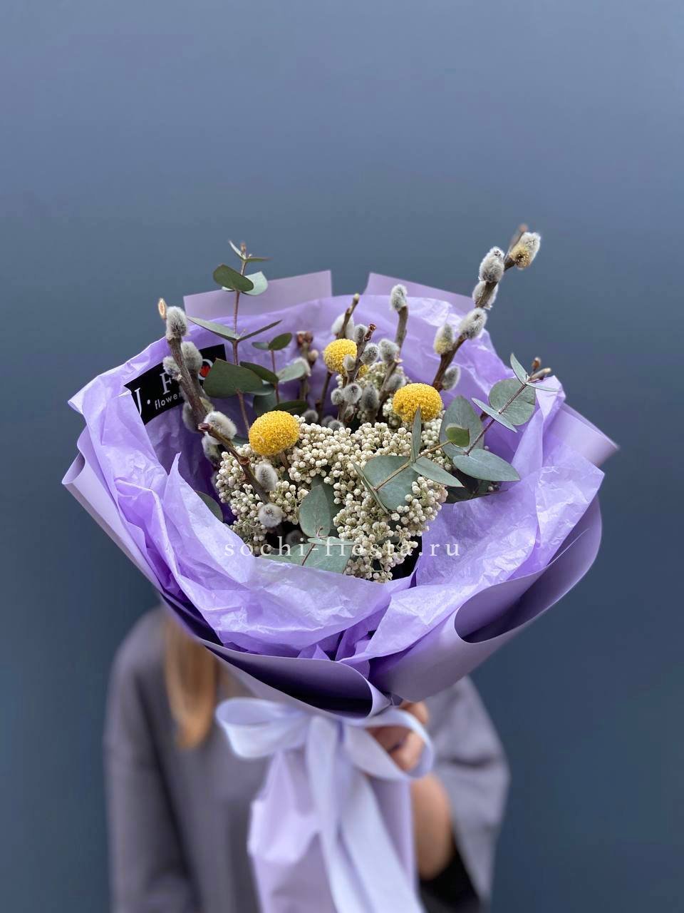 цветочная композиция идеальна для Православных Праздников! Состав выполнен из белых роз, вербы, сирени, диантусов