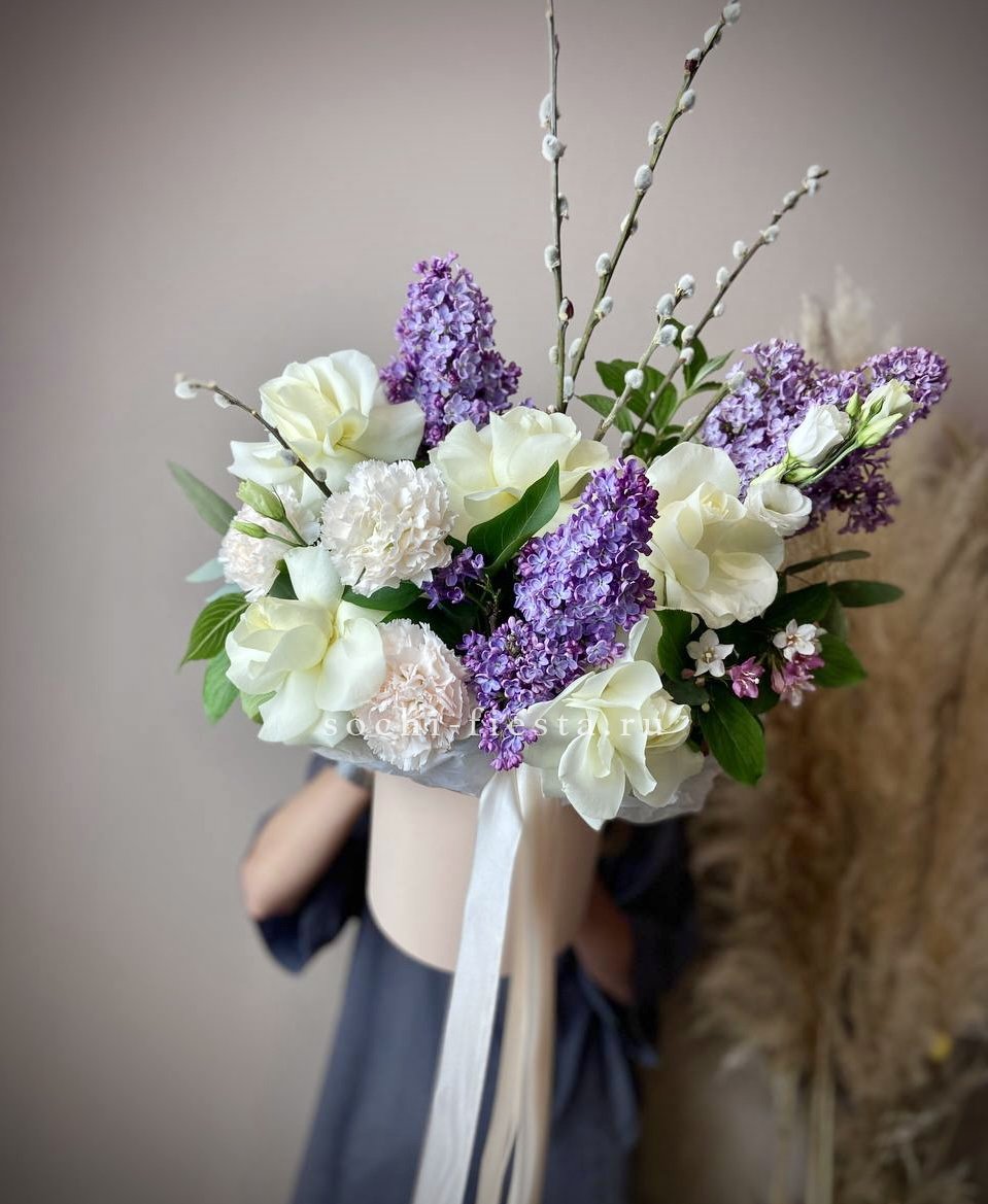 Белые розы образуют спокойную основу композиции, а ветви вербы добавляют вертикальный ритм. Сирень и диантусы заполняют пространство между крупными бутонами, создавая объёмную текстуру. Бокс удобно размещается на столе и сохраняет форму без дополнительного ухода.