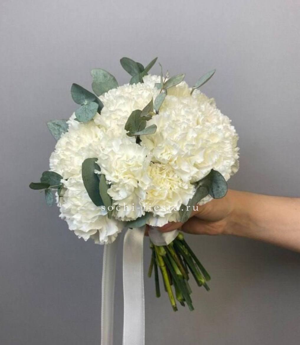 Воздушная сферическая форма с плотной укладкой кремовых и белых бутонов. Пионовидные розы Бомбастик создают объемную текстуру, а диантусы добавляют детали по всей композиции.