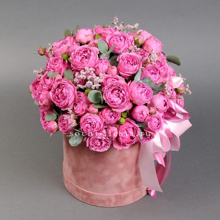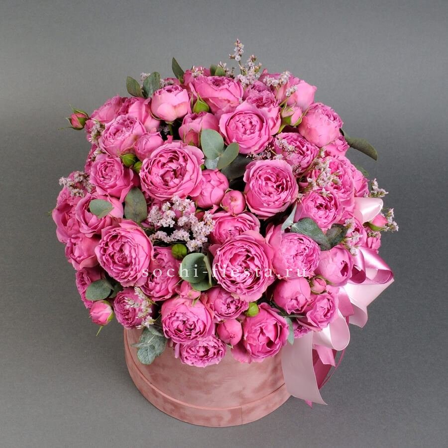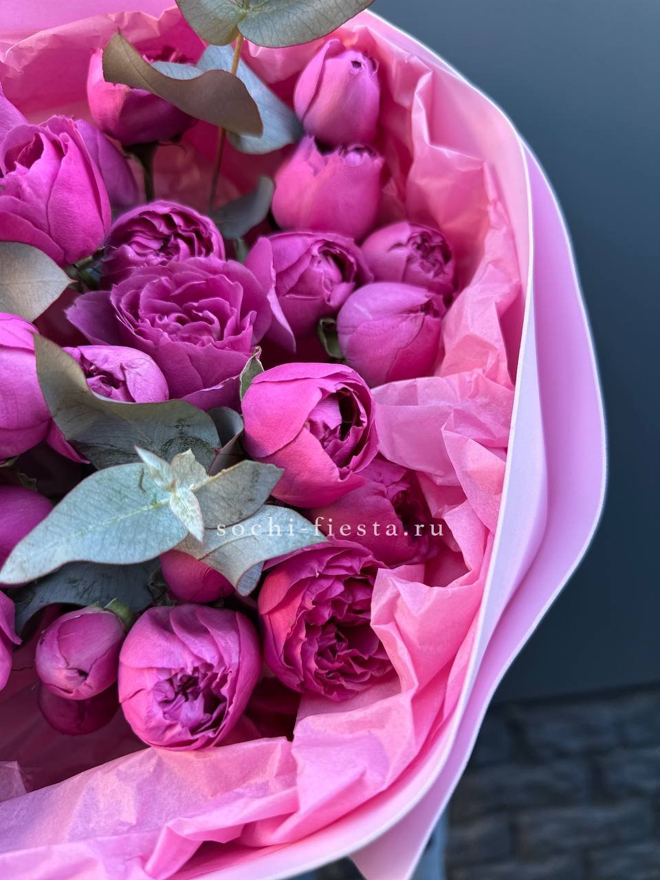 Семь пионовидных роз образуют компактный букет с мягкими линиями и спокойным ритмом. Ветви эвкалипта добавляют воздушности и завершают композицию.